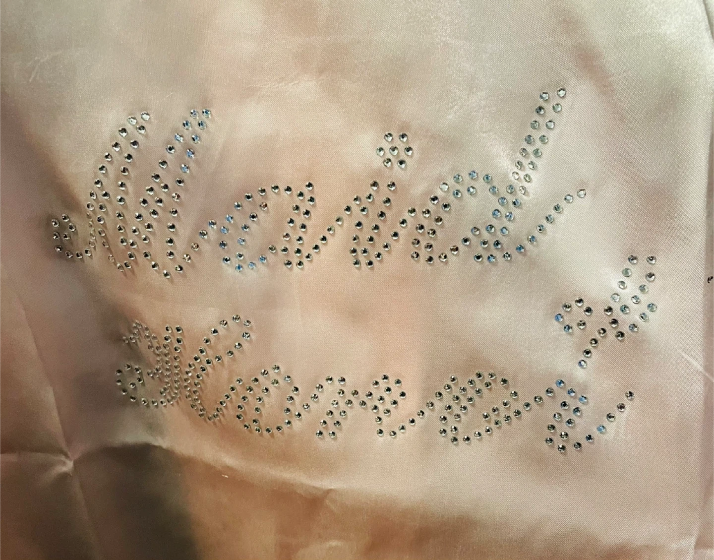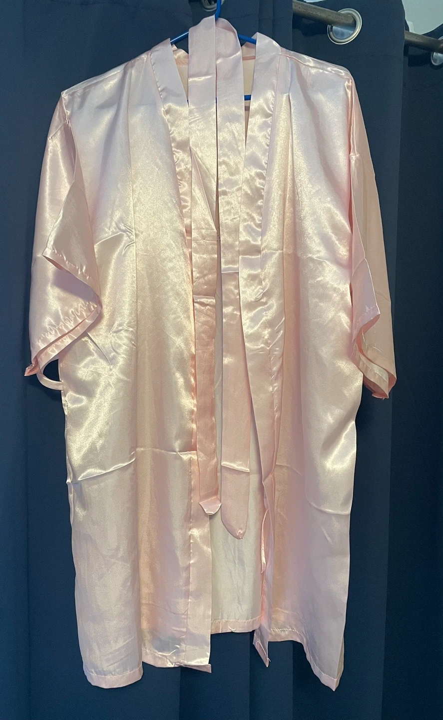 This is a pink satin robe with "Maid of Honor" written in rhinestones on the back. It's a one-size fits most garment. Perfect for getting ready on a wedding day! The ink is the same as the pink on Amazon. Never worn!