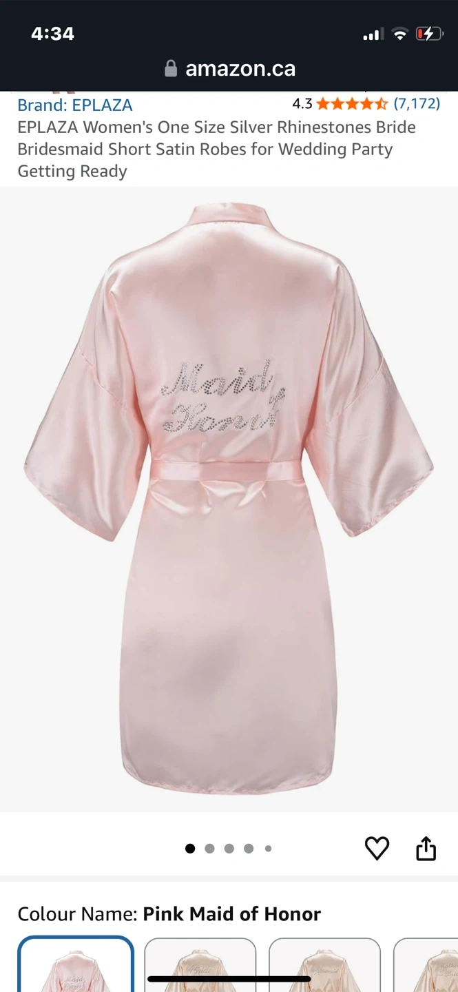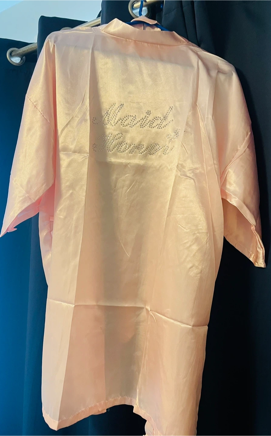 This is a pink satin robe with "Maid of Honor" written in rhinestones on the back. It's a one-size fits most garment. Perfect for getting ready on a wedding day! The ink is the same as the pink on Amazon. Never worn!