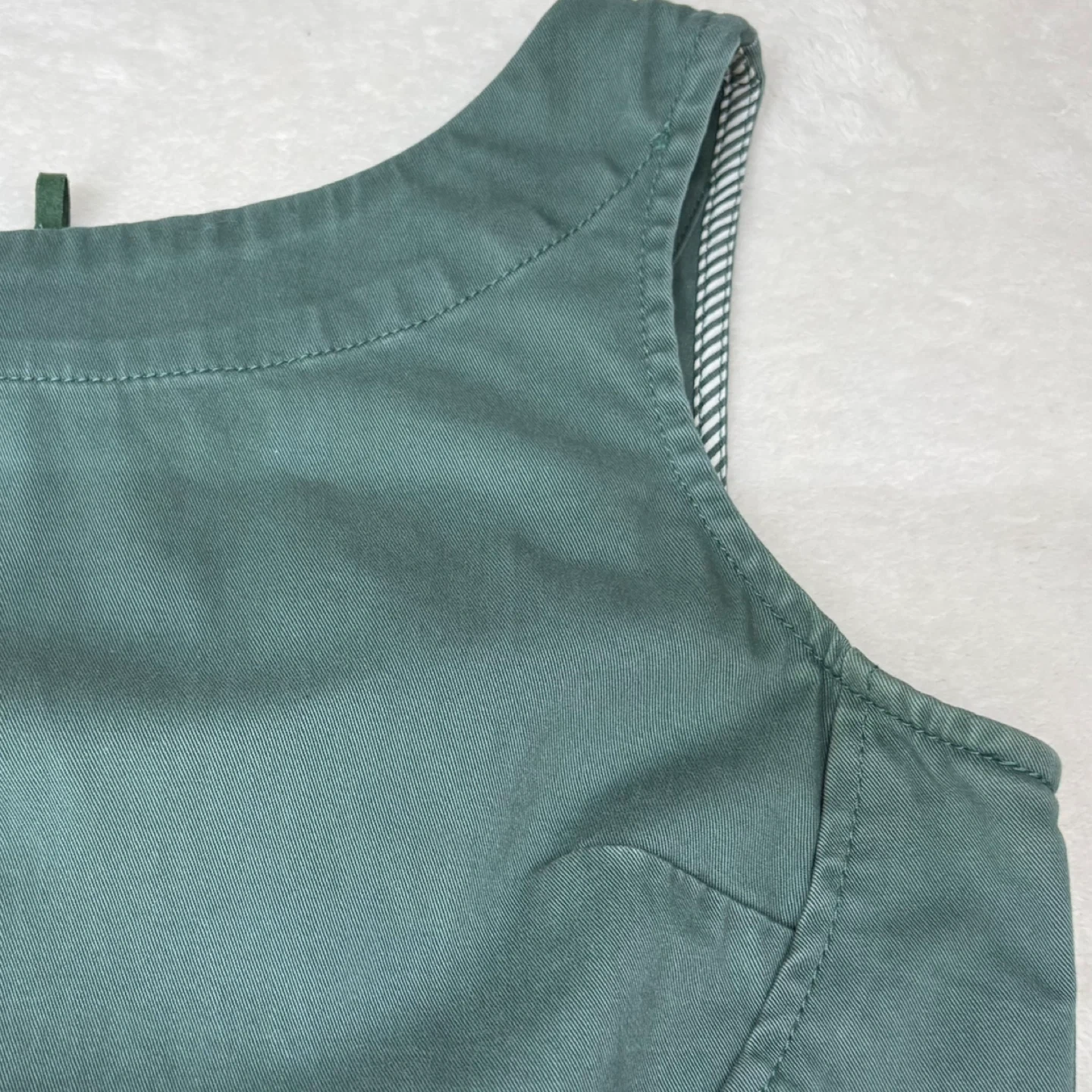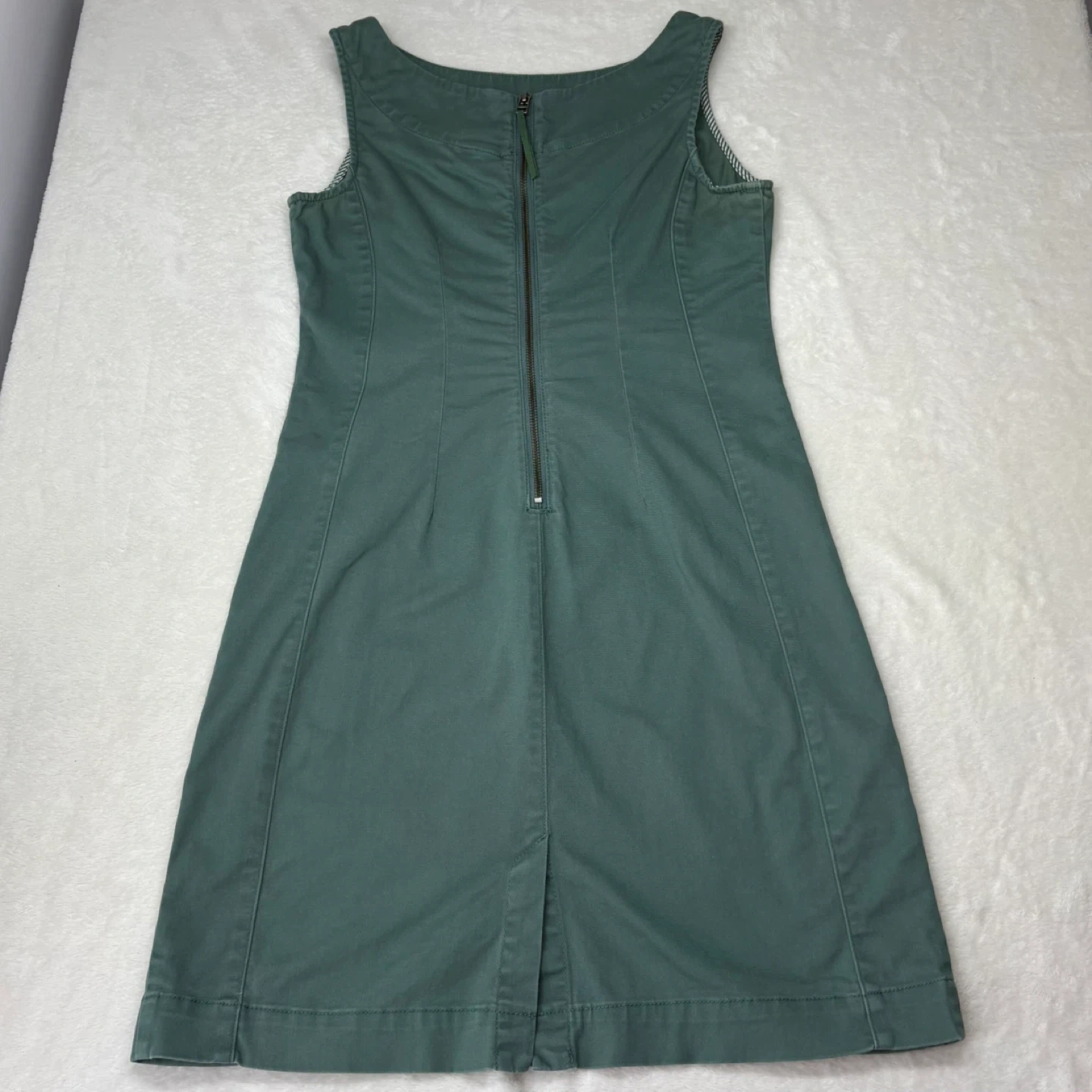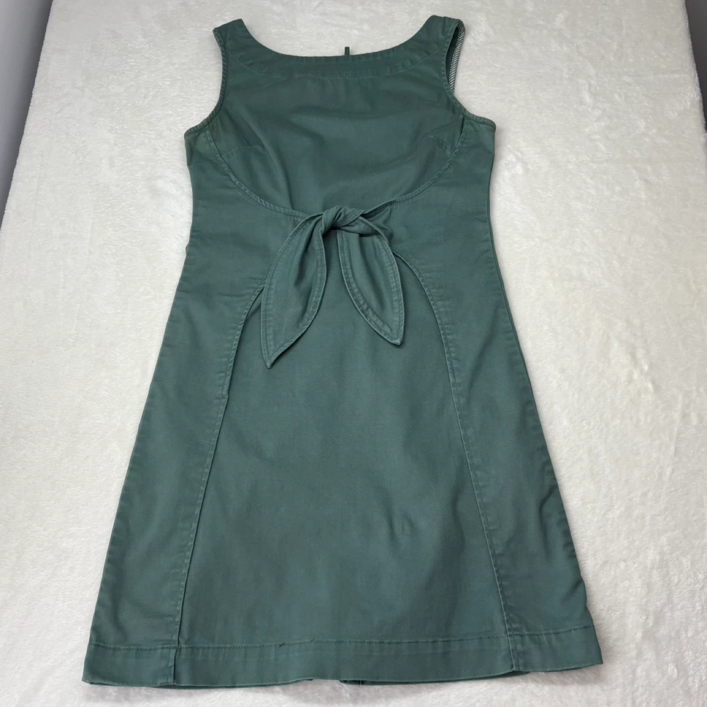 This muted dusty green denim dress features a flattering front tie waist and a classic shift silhouette. Made from a comfortable cotton blend with a hint of stretch, it includes a full-length back zipper and a back slit for ease of movement. The interior armholes are finished with a subtle striped contrast.