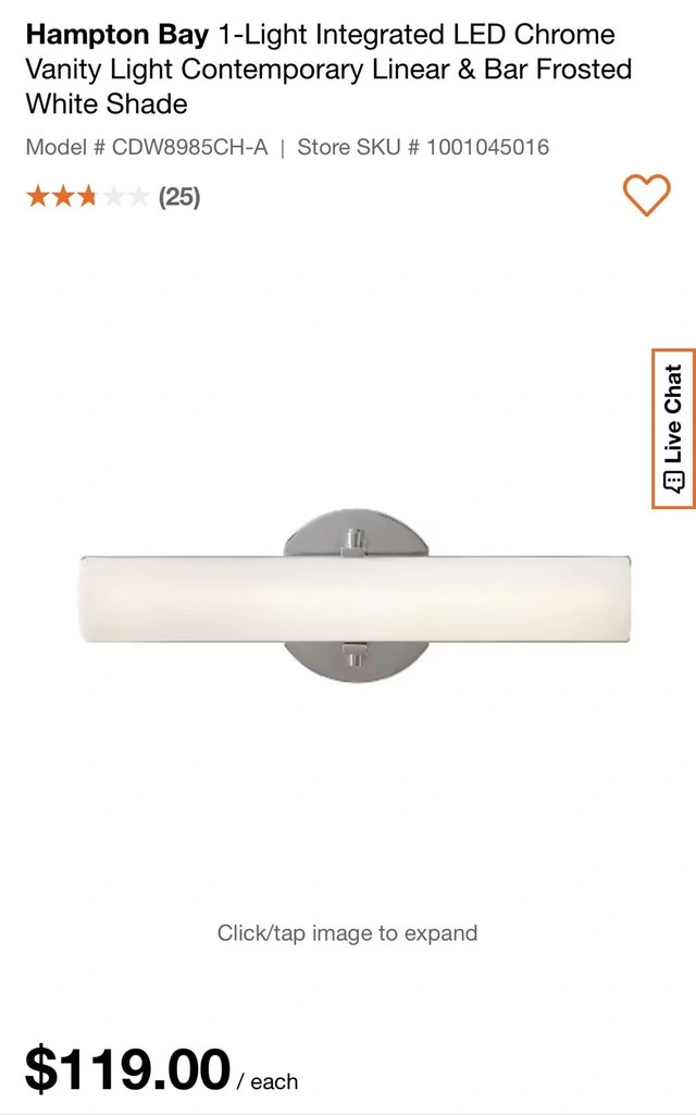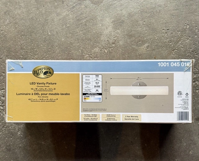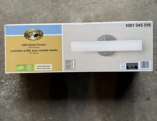 Illuminate your bathroom with this Hampton Bay LED vanity fixture featuring a chrome finish and frosted white shade. It outputs 950 Lumens with a colour temperature of 2700K and is brand new in box. Specifications: Chrome Finish, 18 in. W x 5.9 in. H x 2.4 in. D, Integrated LED, 950 Lumens, 2700K, 50,000 hours of continuous use. If the ad is up, the item is available.