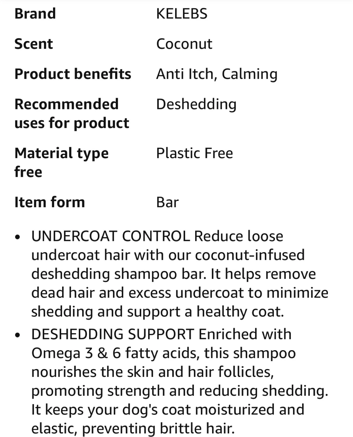 2 Kelebs deshedding dog shampoo bars come in a pack of 3 (I still have one and I don’t need the other two). They are formulated with coconut oil and shea butter for a strong and shiny coat. This shampoo is suitable for normal to sensitive skin and is a natural solution for excessive shedding.