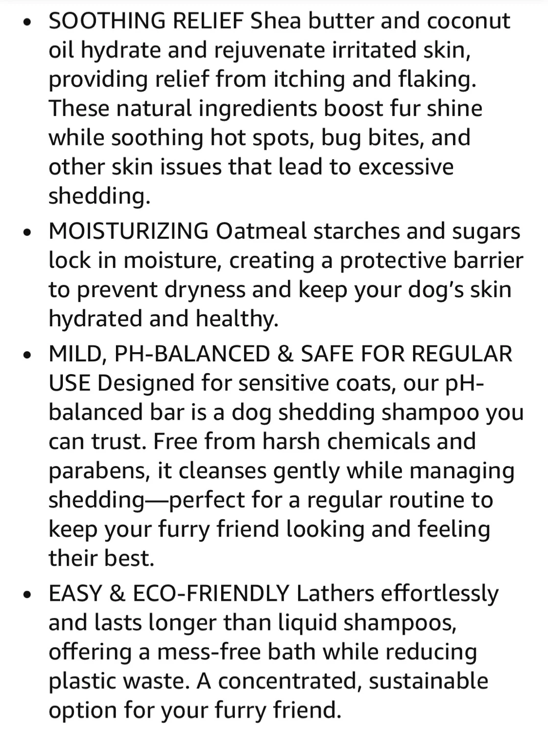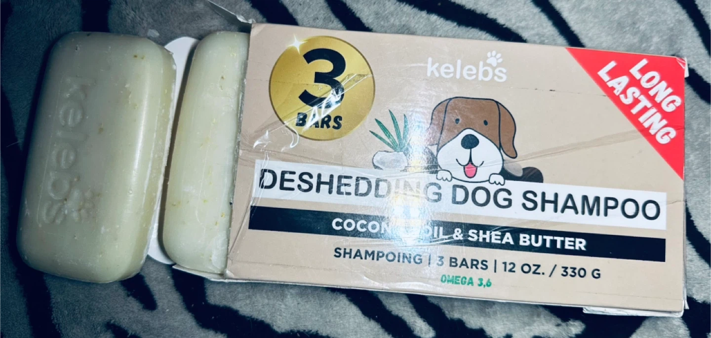 2 Kelebs deshedding dog shampoo bars come in a pack of 3 (I still have one and I don’t need the other two). They are formulated with coconut oil and shea butter for a strong and shiny coat. This shampoo is suitable for normal to sensitive skin and is a natural solution for excessive shedding.