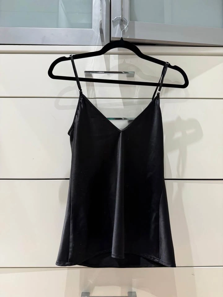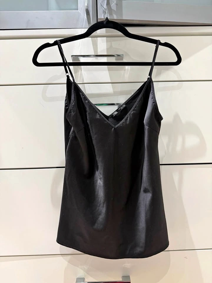 Soft black satin effect cami with a flattering V-neck. Thin shoulder straps. Smooth drape for easy layering. Timeless minimalist style. Brand: Zara. Size: small. Colour: black. Originally purchased for $69.90 + tax. Pick up in North Delta (Sunshine Hills area near Krispy Kreme). Can meet at Richmond Centre or Metrotown for $50+ in purchases.