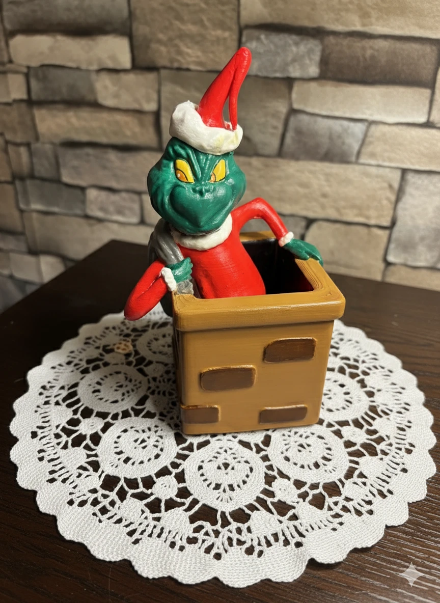 A cute Grinch decoration, featuring the Grinch in a chimney! Perfect for adding a touch of Whoville to your home this holiday season.