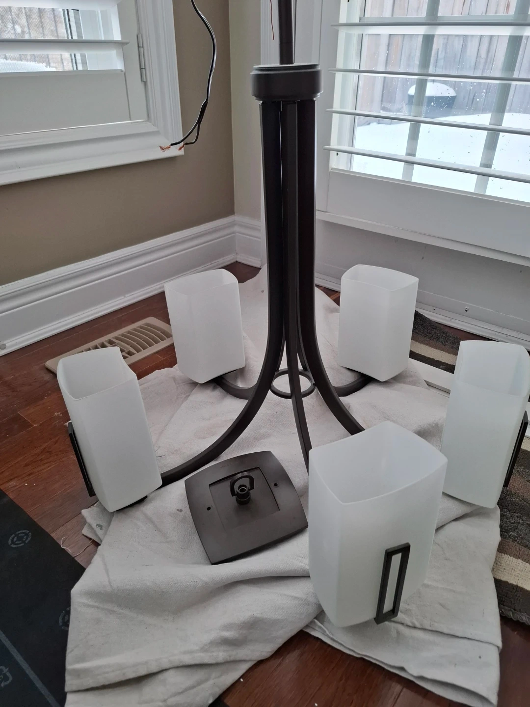 This is a 5-light chandelier fixture by Kichler. It comes with frosted glass shades. This fixture is suitable for a dining room or foyer.