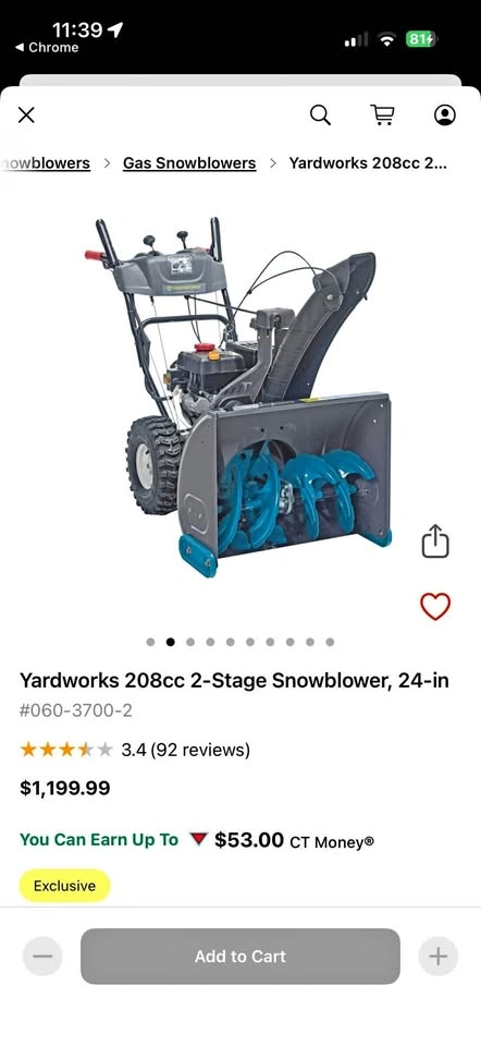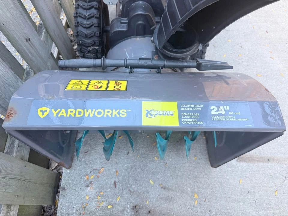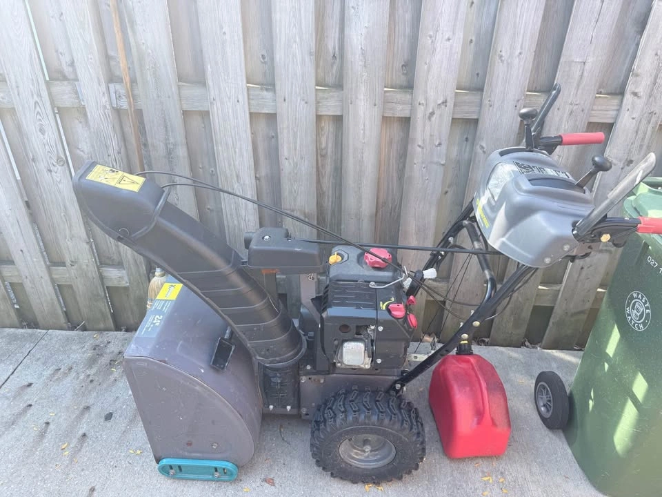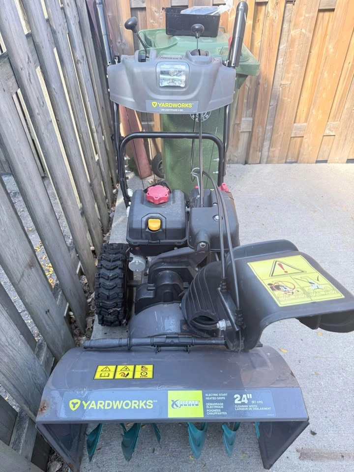 Like new Yardworks 24inch 208cc self propelled gas snow blower - used 2 times last season, great shape. Was gifted to me, and I want to move to a battery powered blower. Retails for 1200 + tax at Canadian Tire. Comes with half a can of gas too! Serious buyers only please!