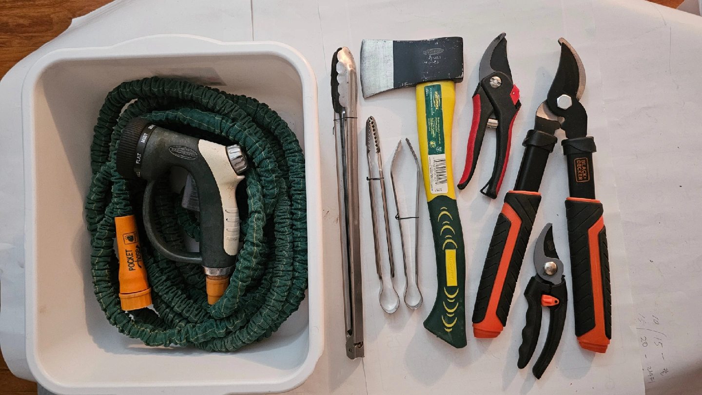 Selling a collection of garden tools, including a Yardworks Pocket Hose with spray nozzle, tongs, an axe, and Black+Decker pruners. Everything is in good condition and ready to help with your gardening needs this season
