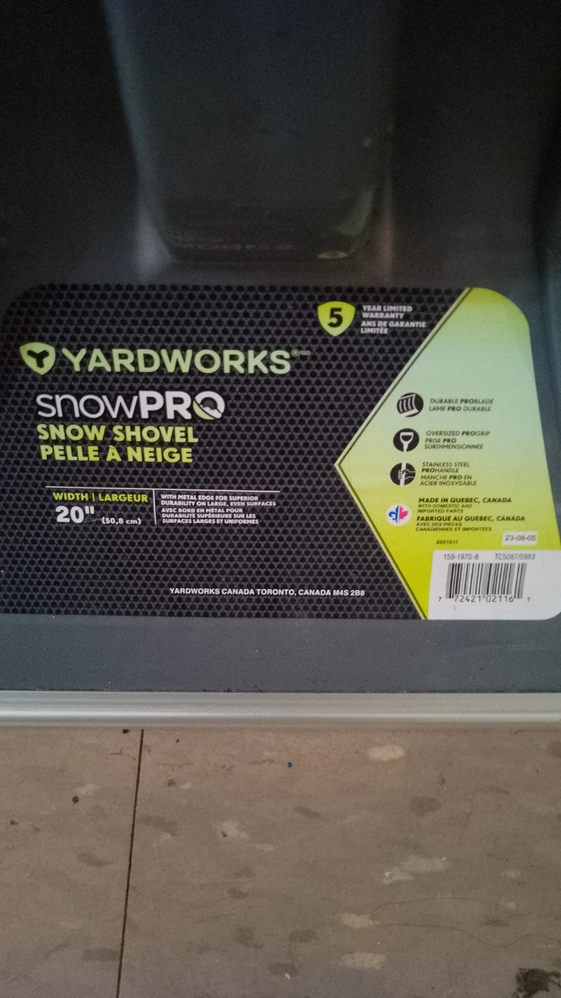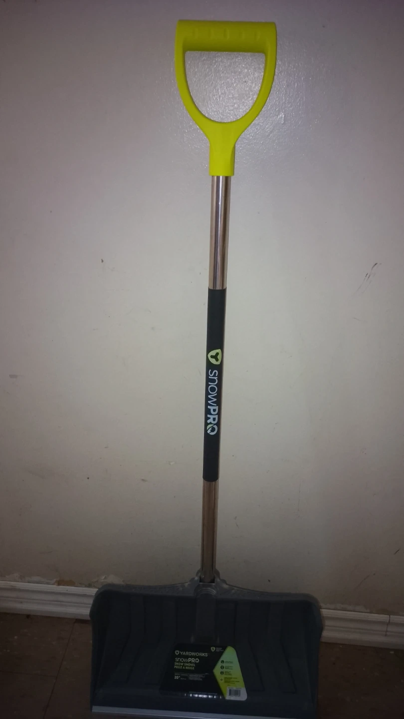 124Yardworks SnowPro snow shovel, 20 inches wide. Durable pro blade, oversized pro grip, stainless steel blade edge for superior rigidity on ice and uneven surfaces