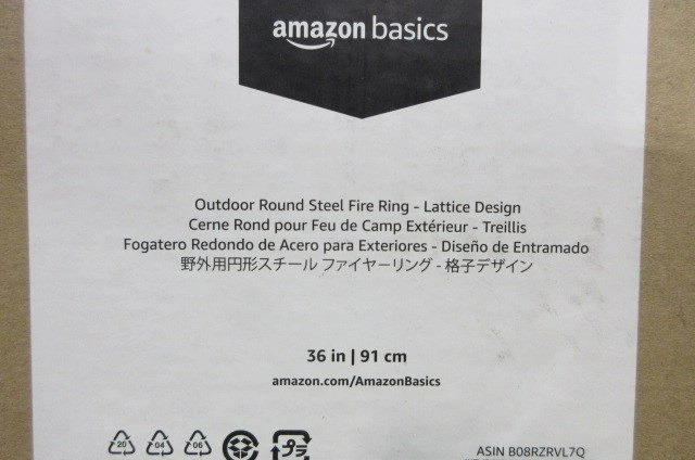 Selling a brand new Amazon Basics 36-inch steel fire ring, still in its original packaging! This outdoor round fire ring features a lattice design and is perfect for adding a cozy touch to your backyard or patio. It measures 36 inches in diameter and 12 inches in height, making it a great size for gatherings. The lot number is 2023120.