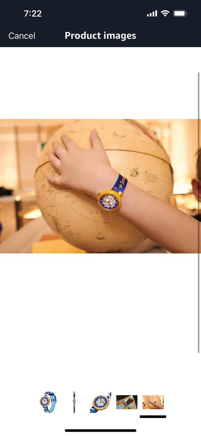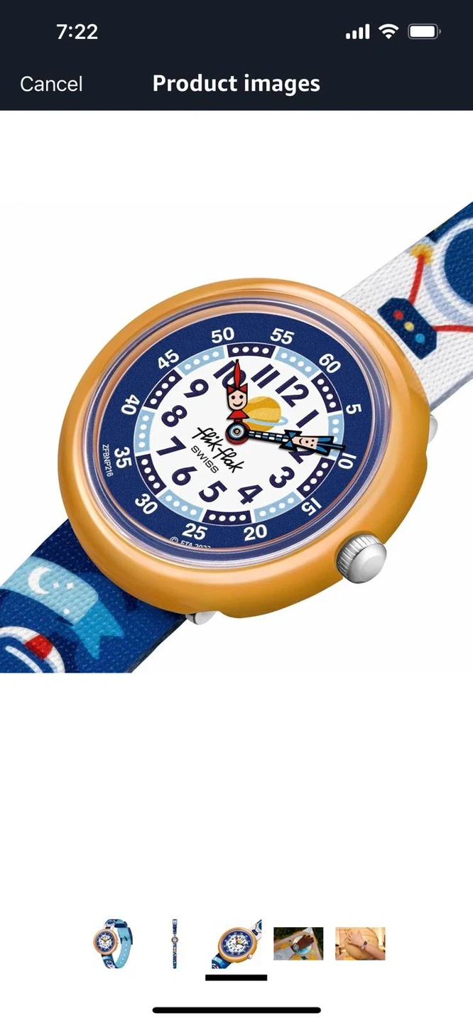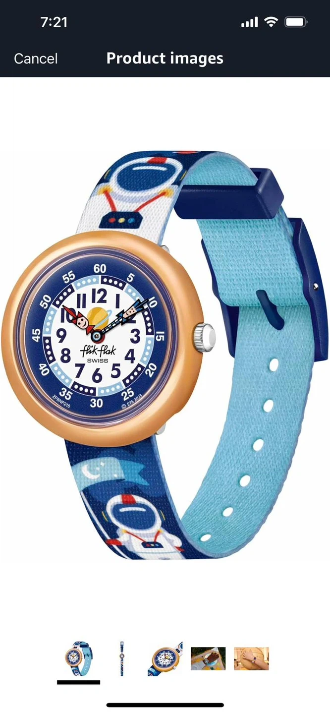 This New Flik Flak watch features a fun space and astronaut design on the strap. It's perfect for teaching kids how to tell time. The watch has a blue dial and an orange casing.