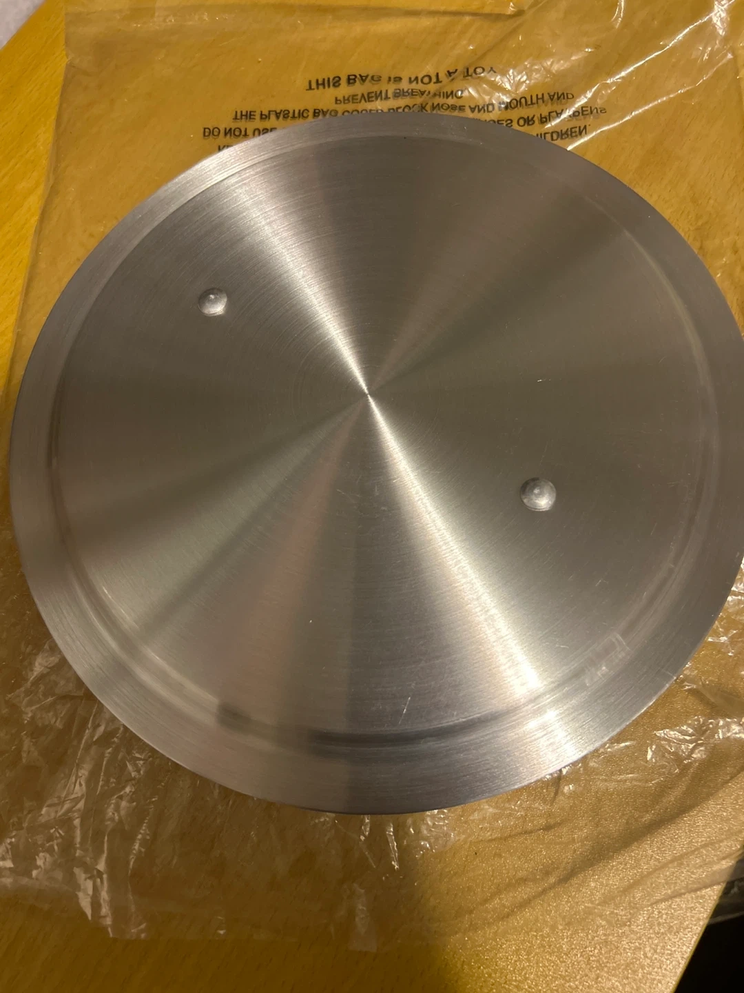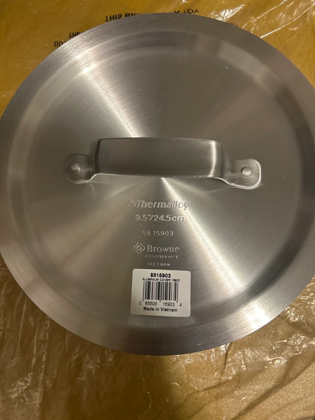 This is a Browne Foodservice Thermalloy lid. It's 9.5 inches or 24.5cm in diameter. Made from aluminum alloy. This lid is useful for covering pots and pans to retain heat and moisture during cooking. It has a central handle for easy lifting.