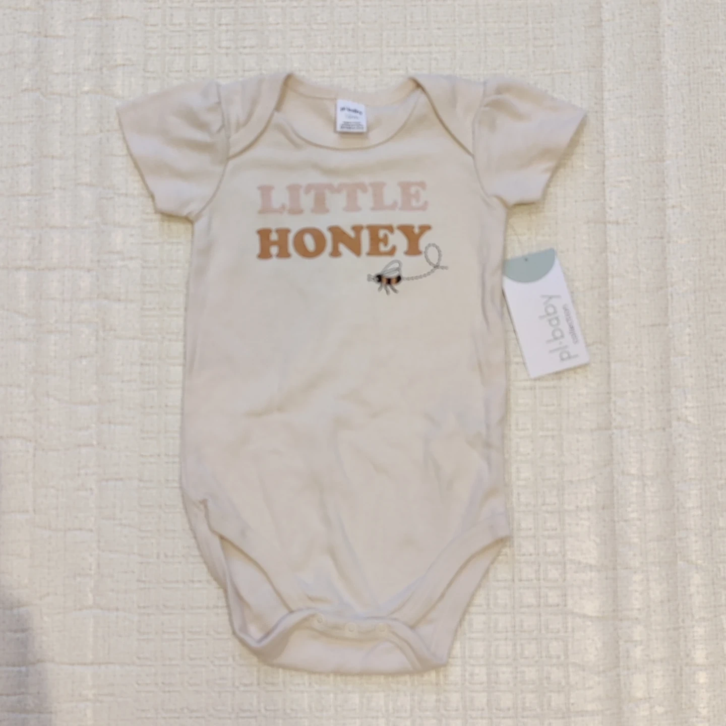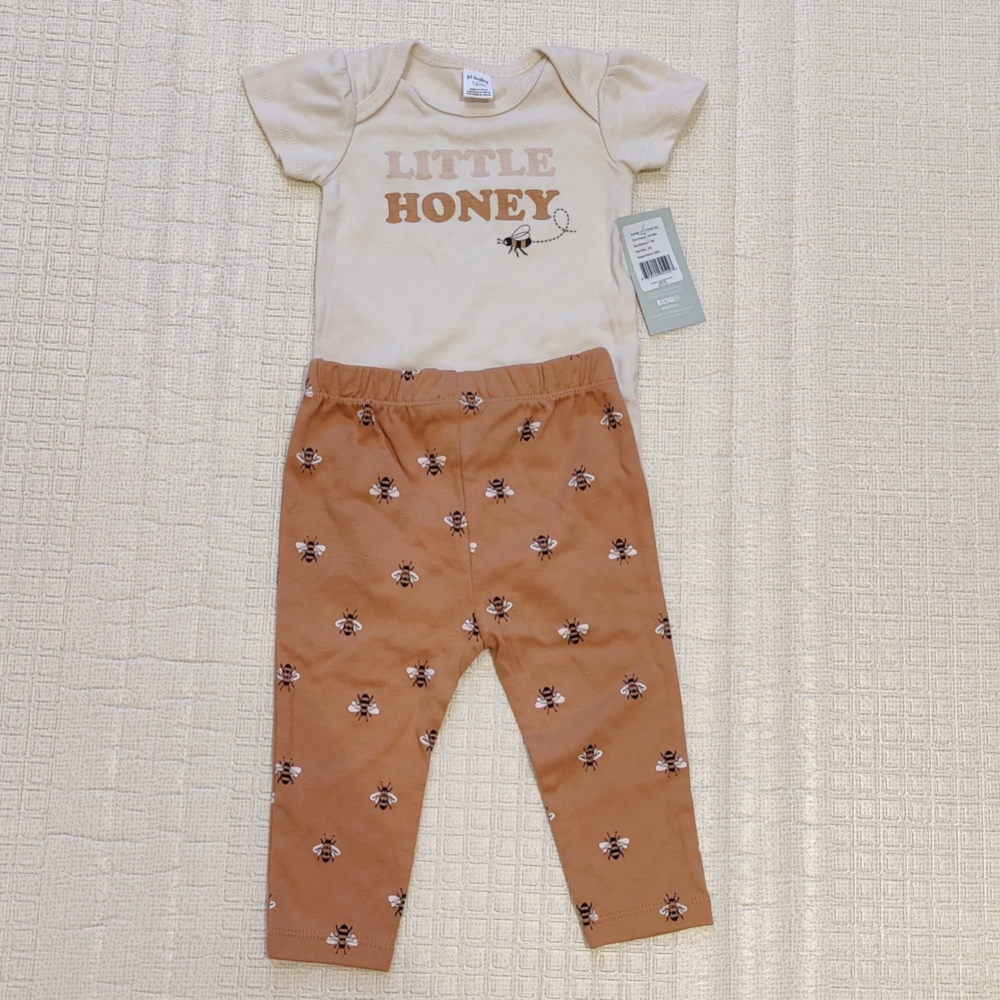 This cute baby set features a cream onesie with "Little Honey" text and a bee graphic.