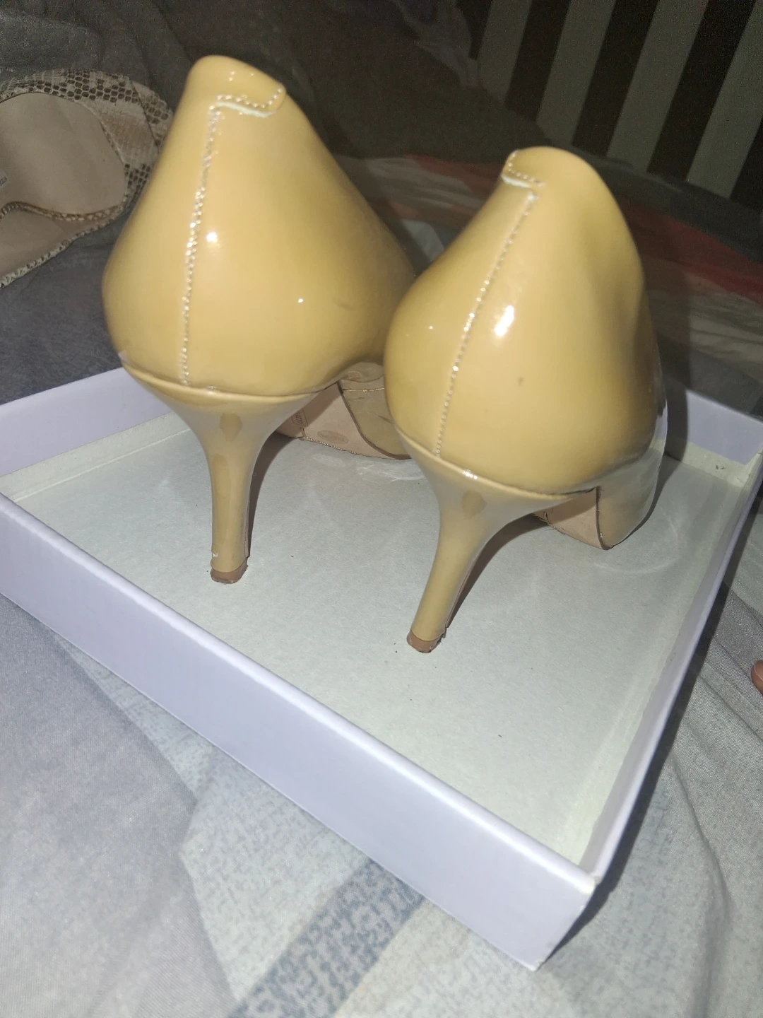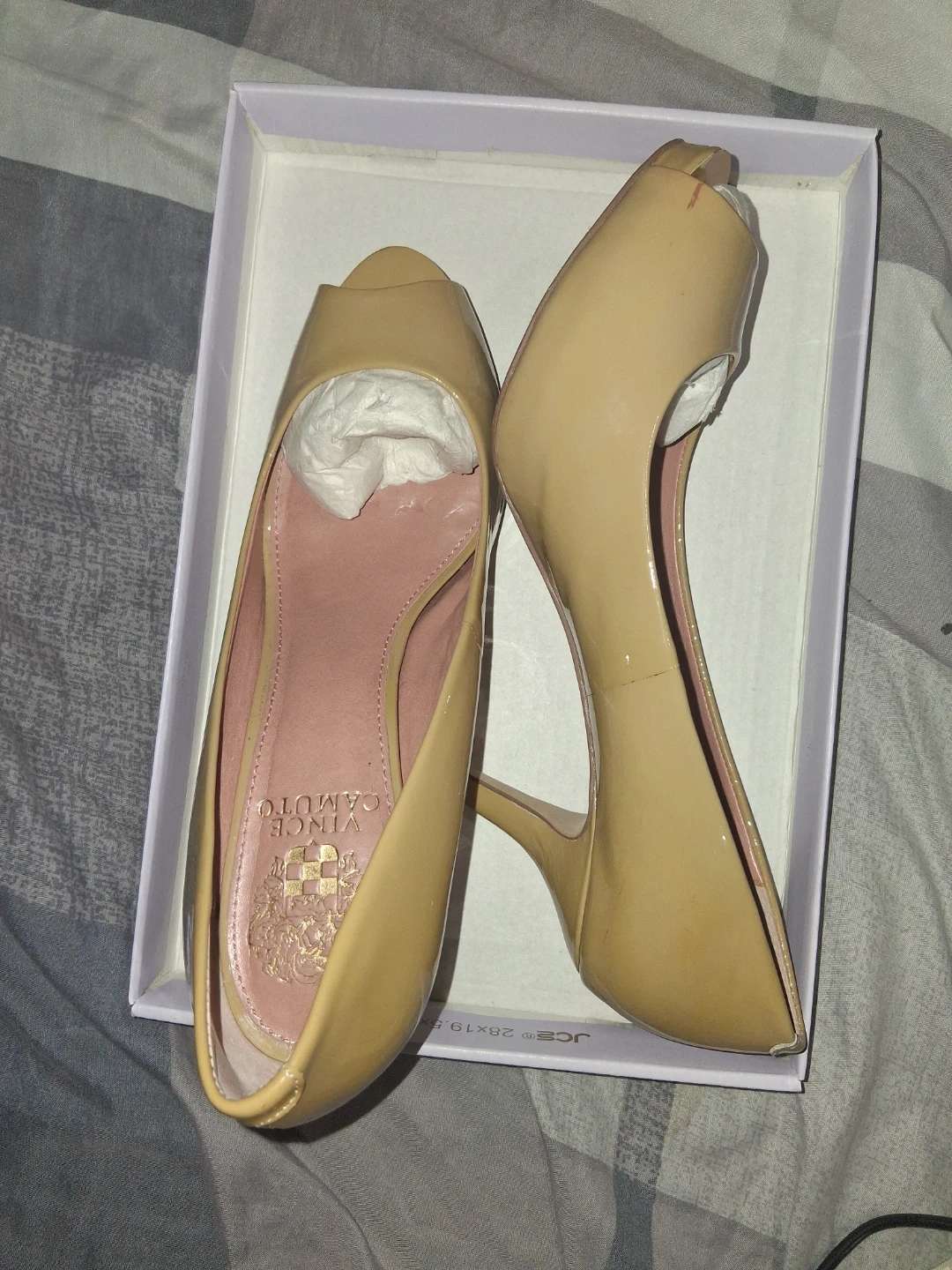Vince Camuto patent leather peep-toe heels in a neutral beige shade. These heels feature a glossy finish and a classic pump silhouette.