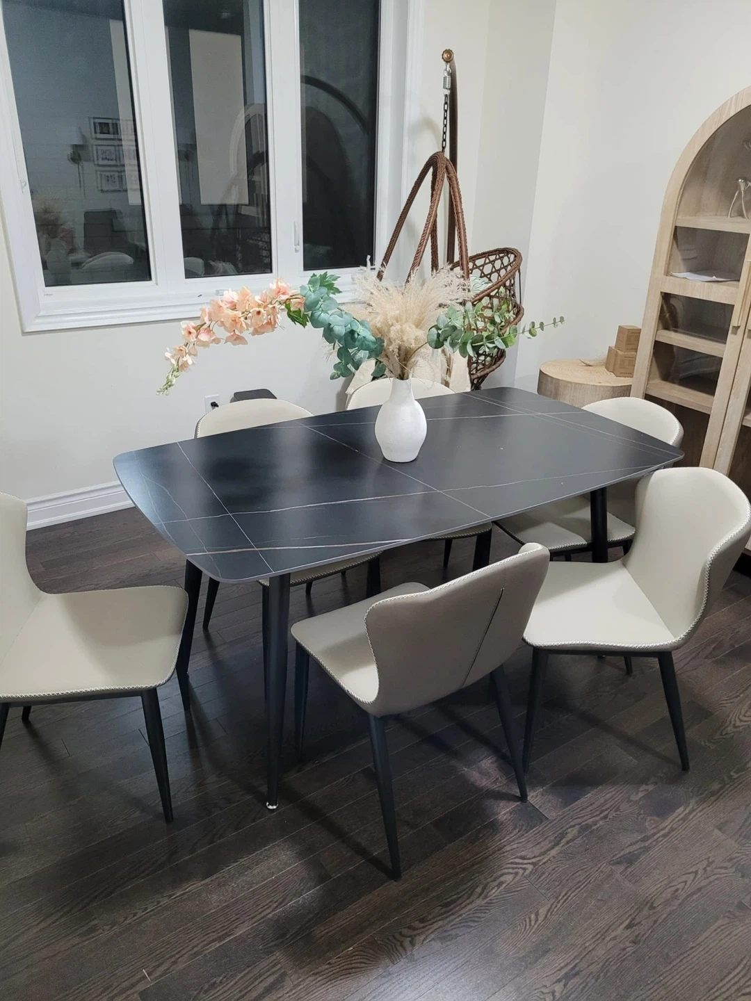 Rectangular dining table with a marble-look top and black tapered legs. It's suitable for seating up to six people. This table's sleek design makes it a great centerpiece for your dining area.