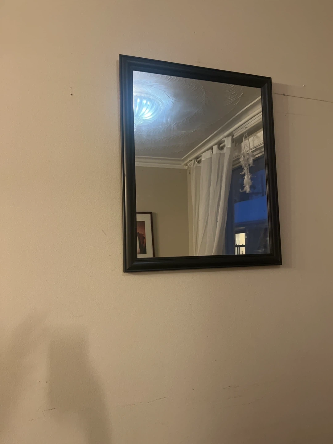 A simple black framed wall mirror. It's perfect for checking your look before heading out or adding a bit of light to a room. The frame is a classic black, fitting into many decor styles.