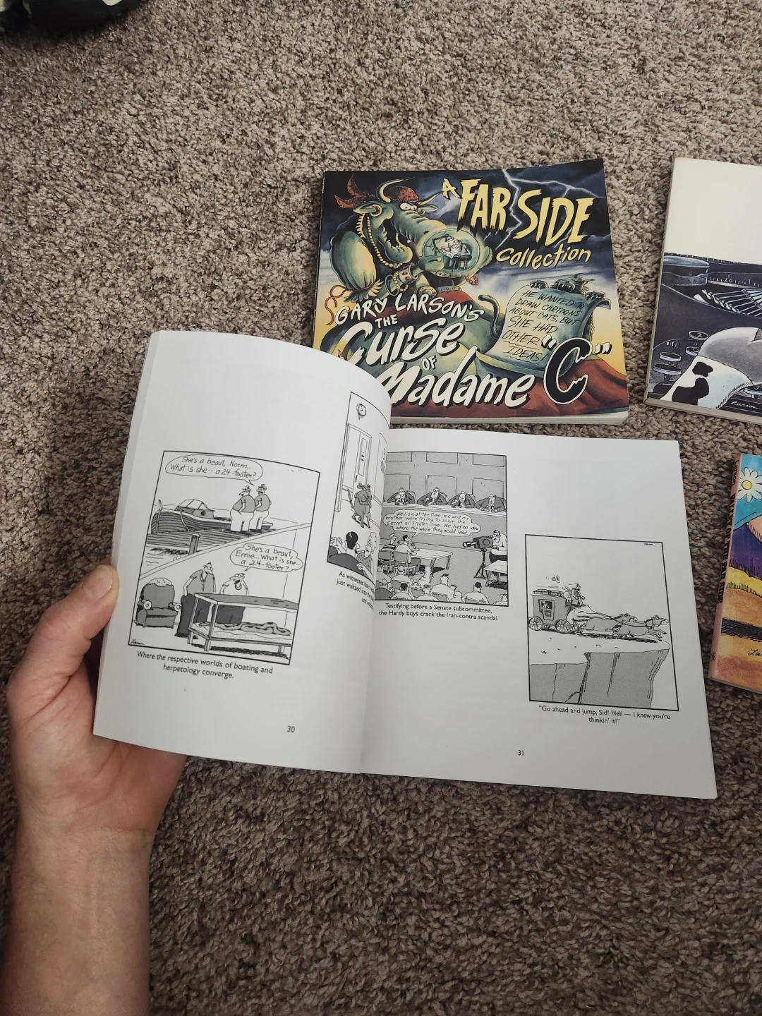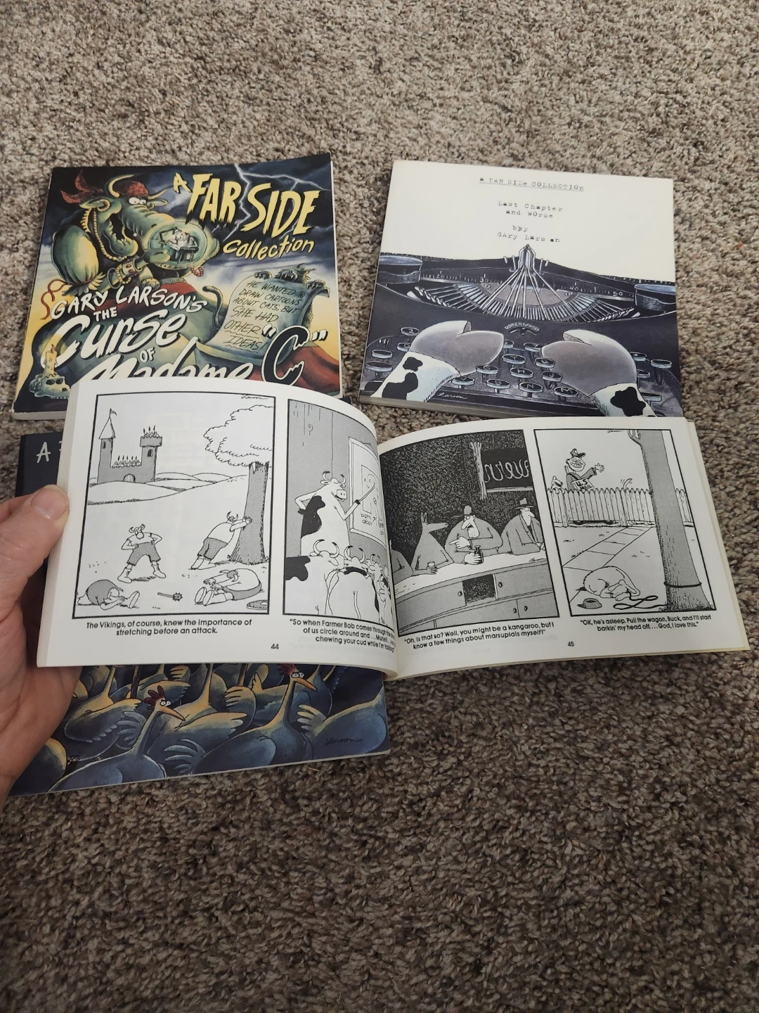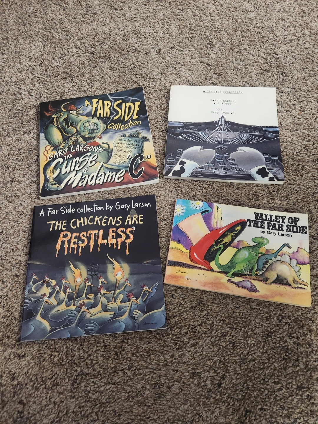 Bundle of four Far Side comic collections by Gary Larson. Titles include "The Curse of Madame C," "Valley of the Far Side," and "The Chickens Are Restless." Perfect for fans of this classic comic strip!