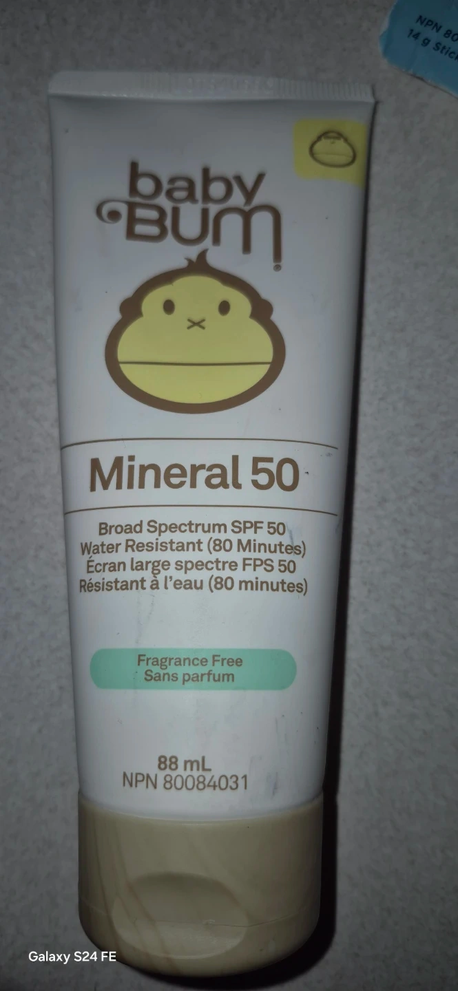 Baby Bum Mineral 50 Sunscreen in a fragrance-free formula. It's broad spectrum SPF 50 and water resistant for 80 minutes. This tube contains 88ml of product. Mineral sunscreen for everyone!, all 3 brand new not opened , dates are good .