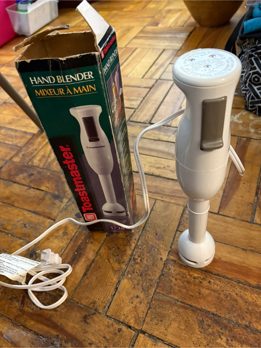 This is a Toastmaster hand blender. It's white and comes with its original box. The box has some wear and tear.