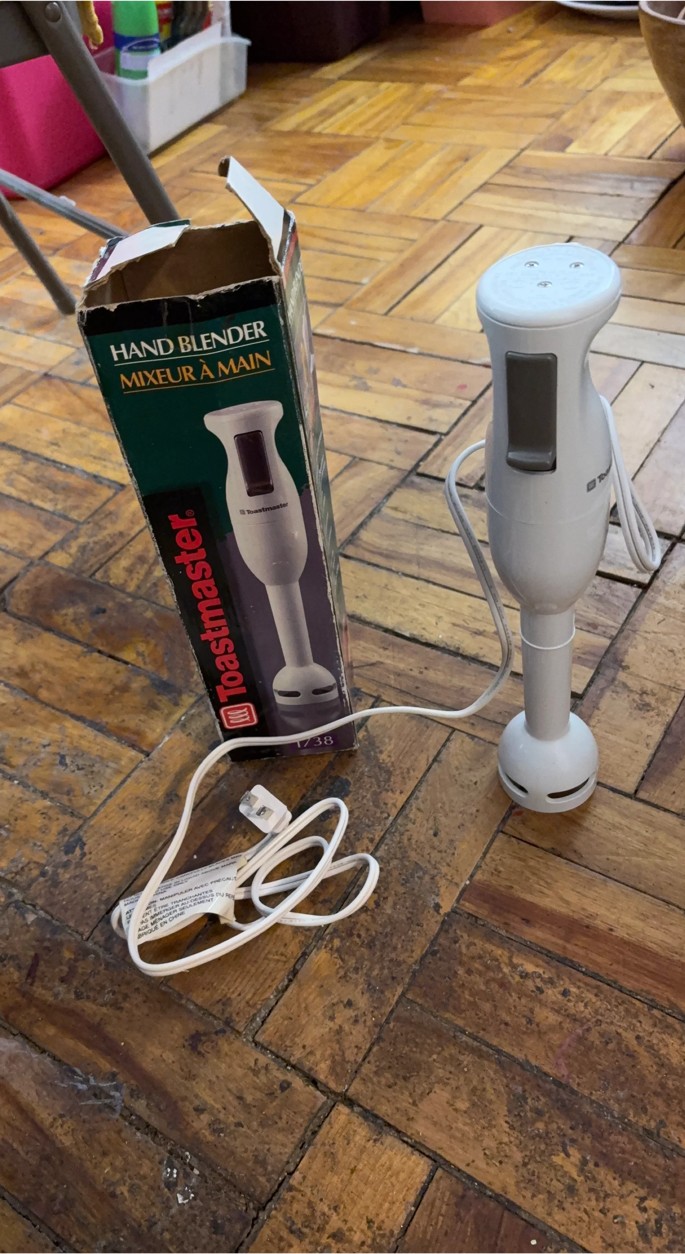 This is a Toastmaster hand blender. It's white and comes with its original box. The box has some wear and tear.