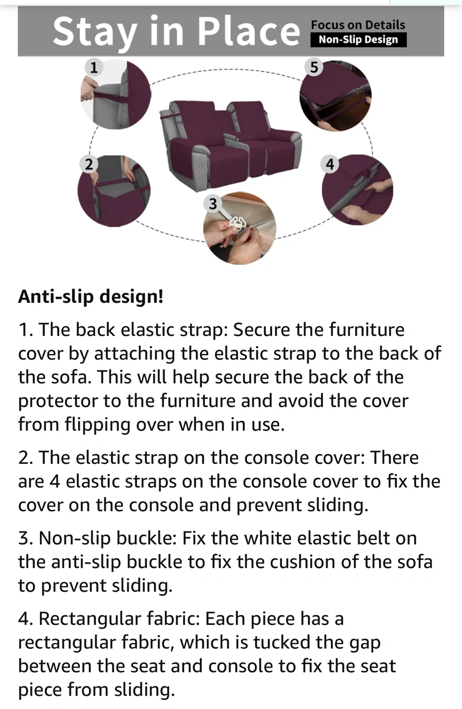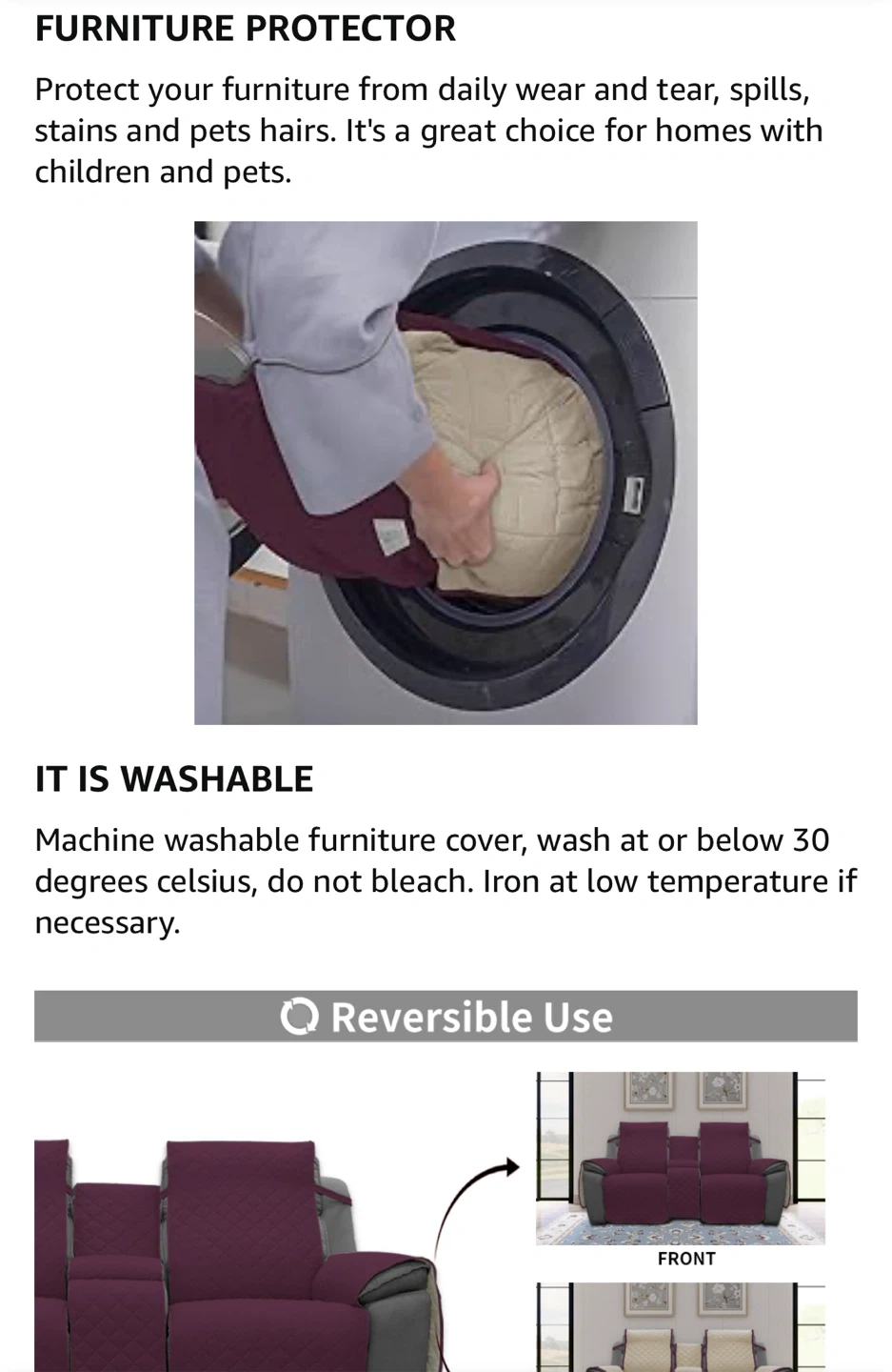 This Easy-Going recliner loveseat cover is in wine/beige and made of microfiber. It's anti-slip, reversible, and washable. It's designed as a split sofa cover for each seat with elastic straps, perfect for kids and pets. The cover comes in 3 pieces and features an anti-slip design to keep it in place