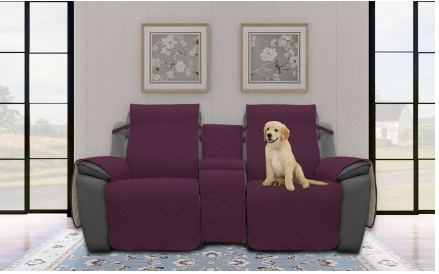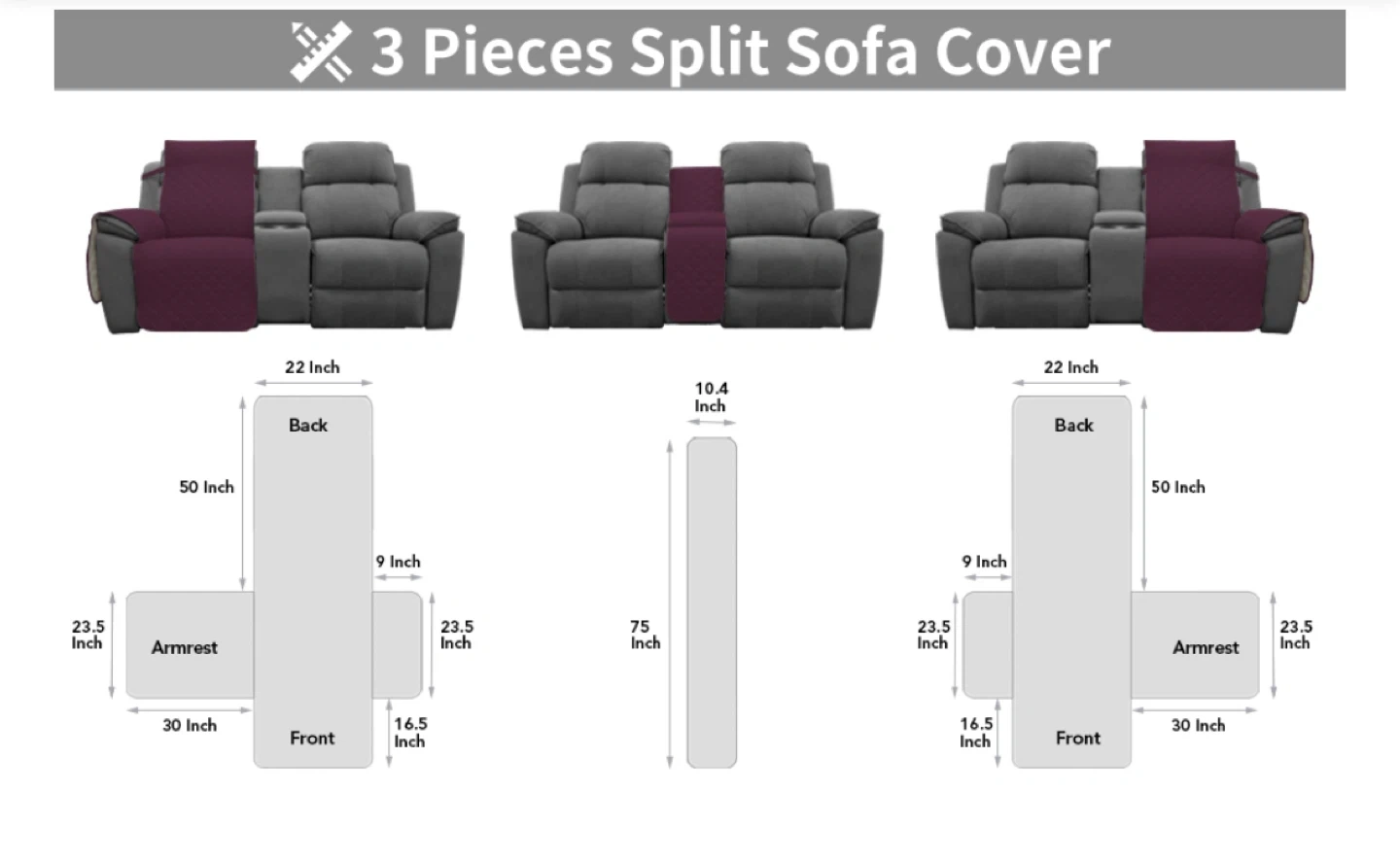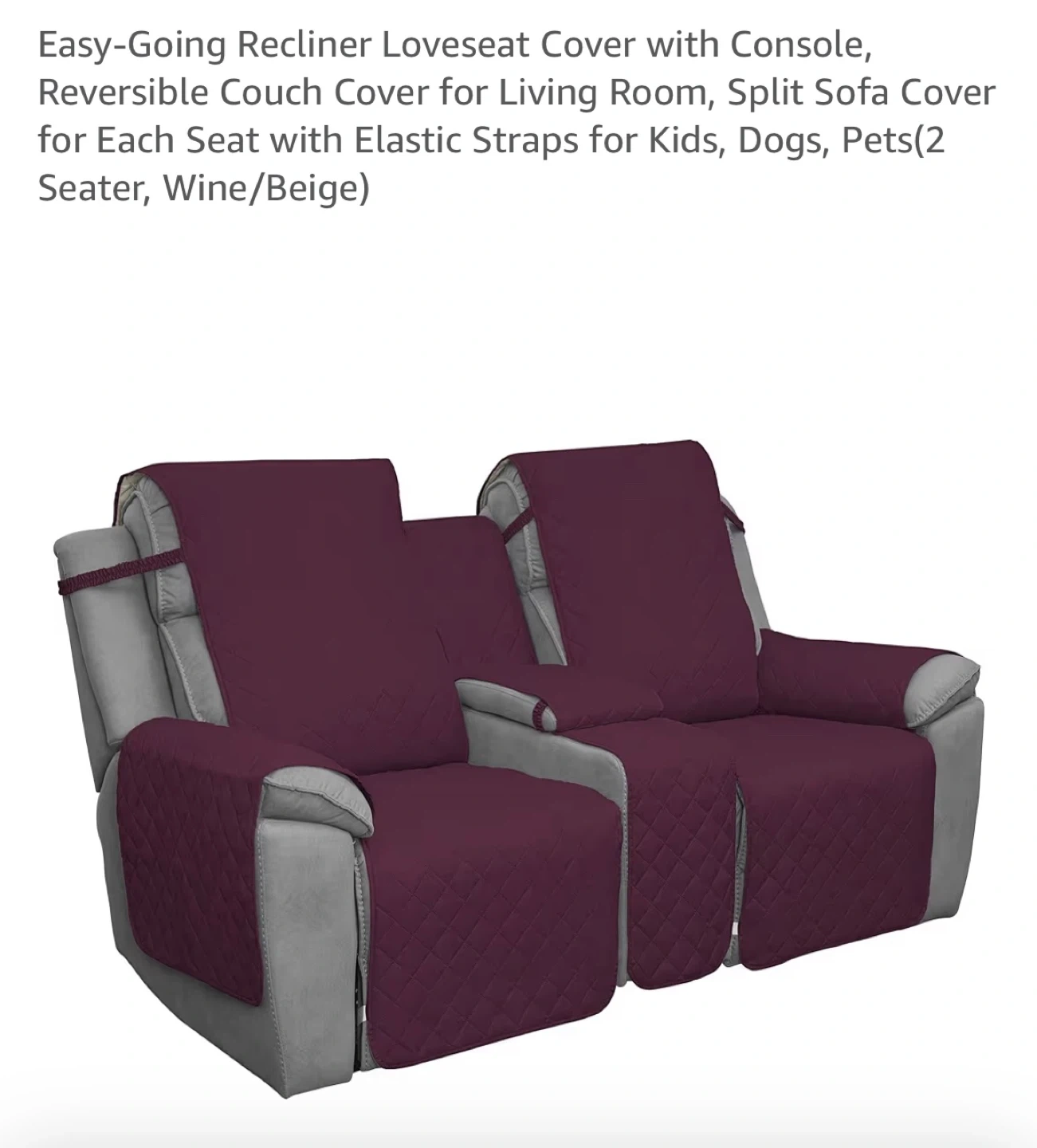 This Easy-Going recliner loveseat cover is in wine/beige and made of microfiber. It's anti-slip, reversible, and washable. It's designed as a split sofa cover for each seat with elastic straps, perfect for kids and pets. The cover comes in 3 pieces and features an anti-slip design to keep it in place