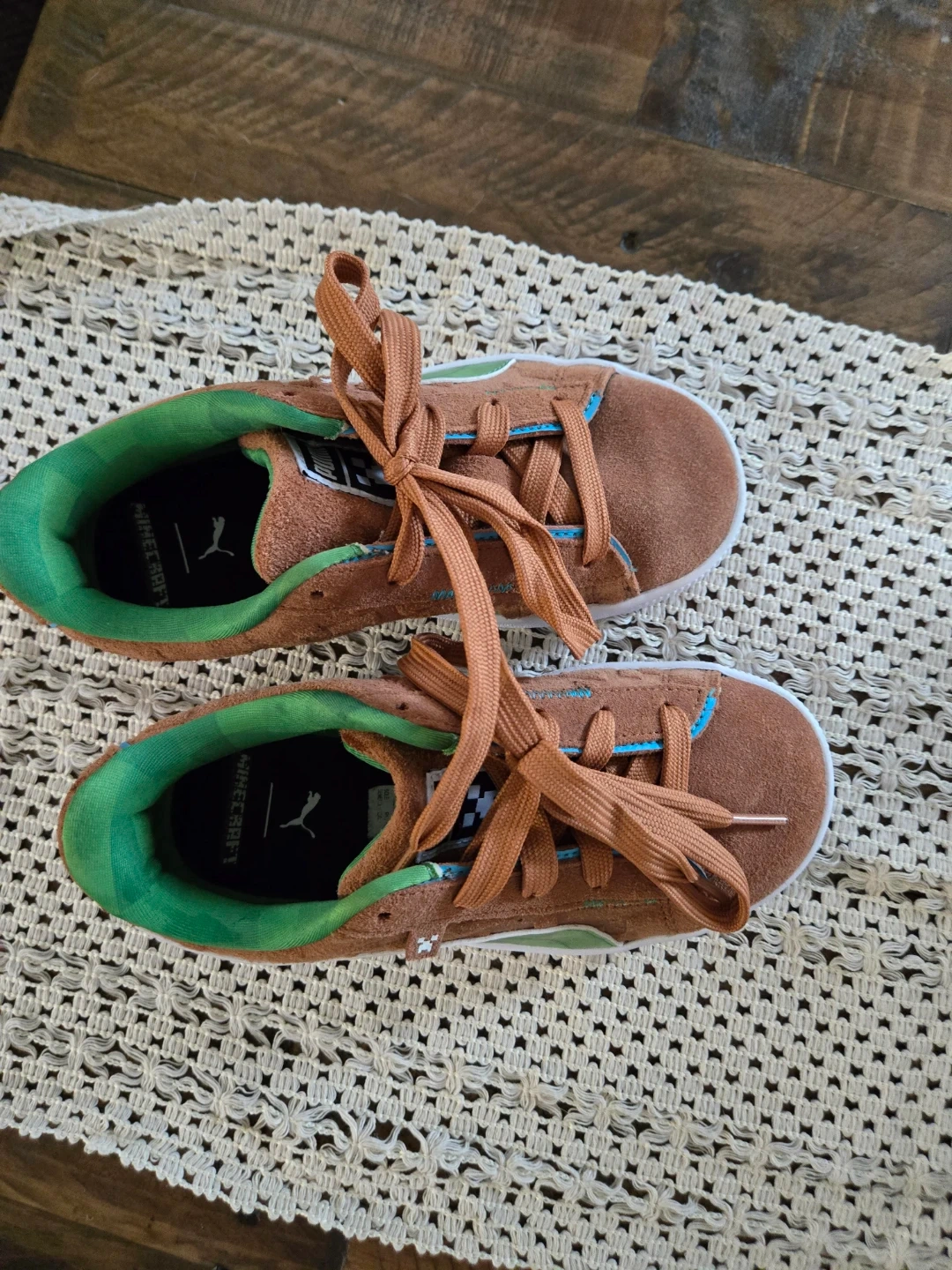 These Puma Suede Classic sneakers feature a fun Minecraft-inspired design. They have brown suede uppers with green accents and laces. Perfect for little gamers who love adventure!