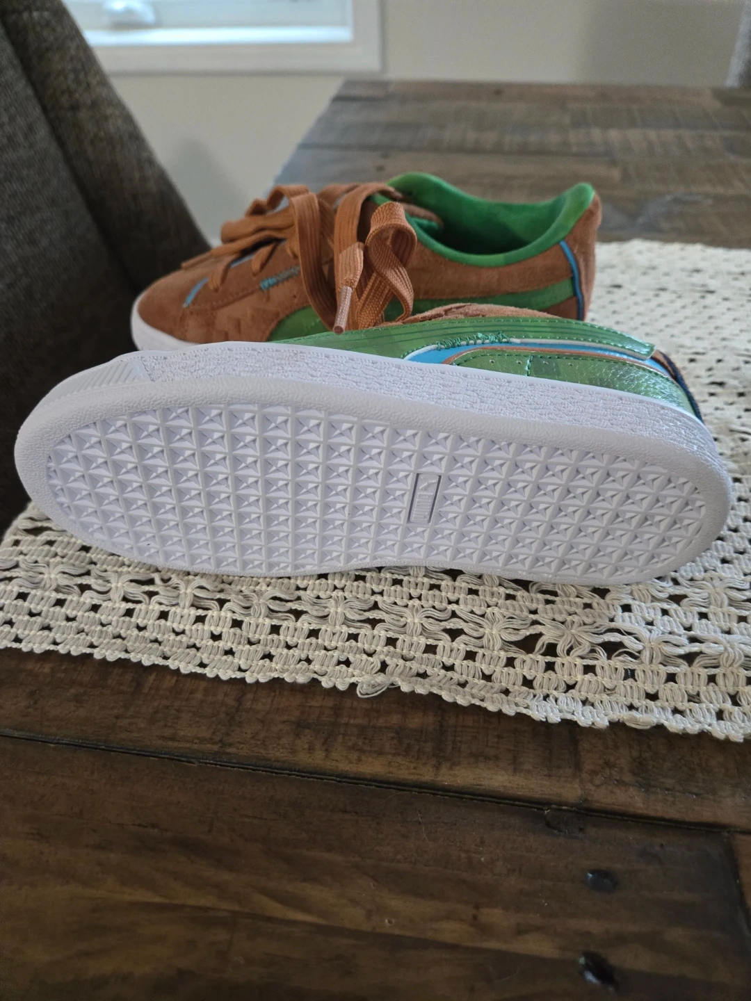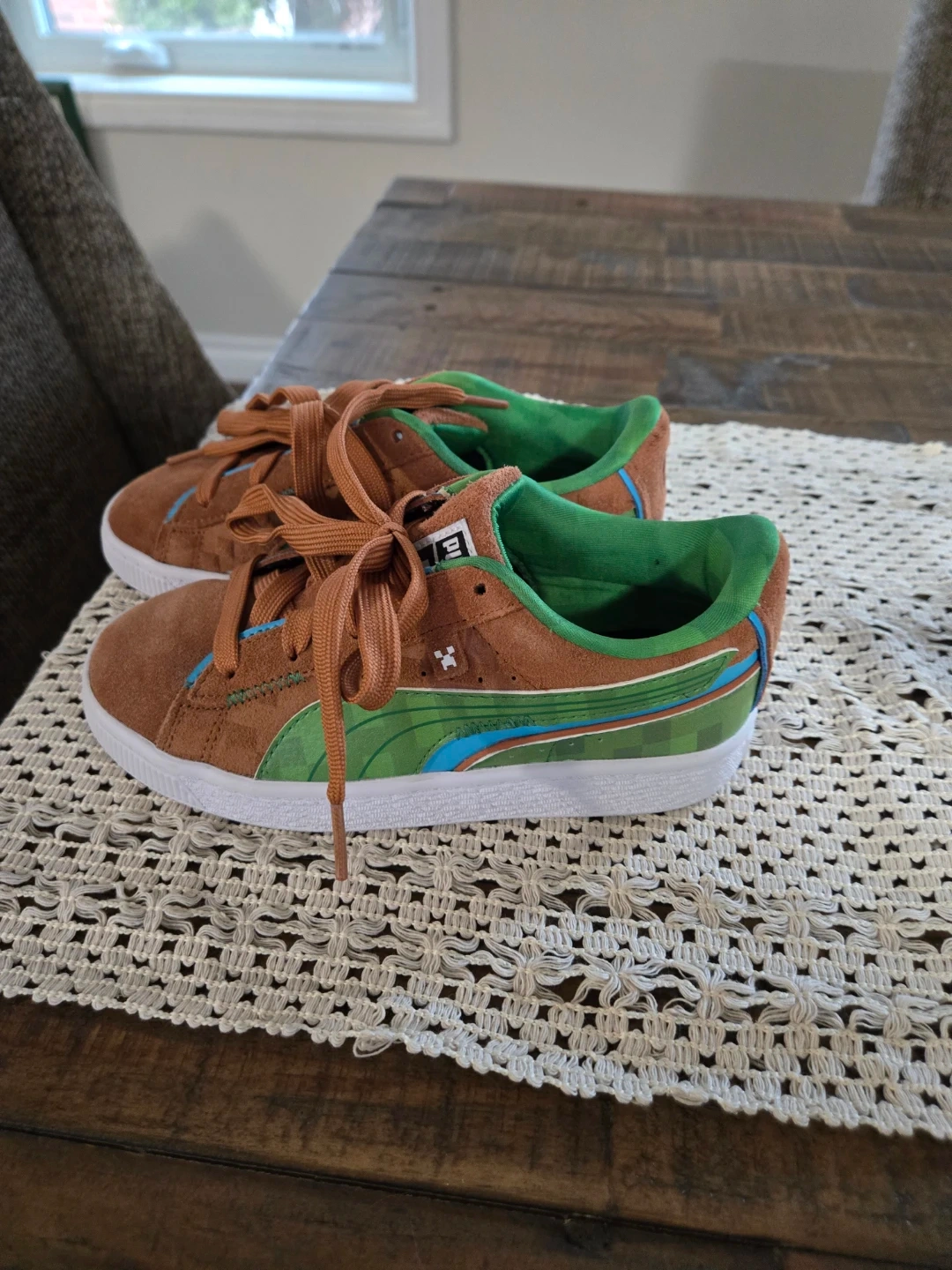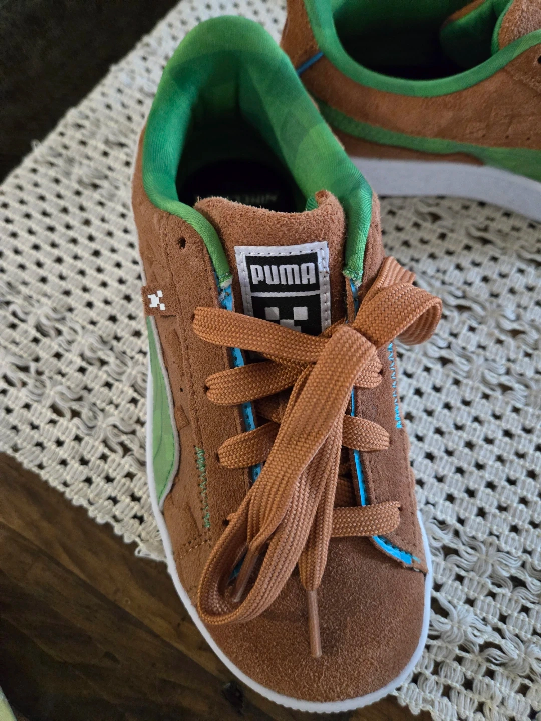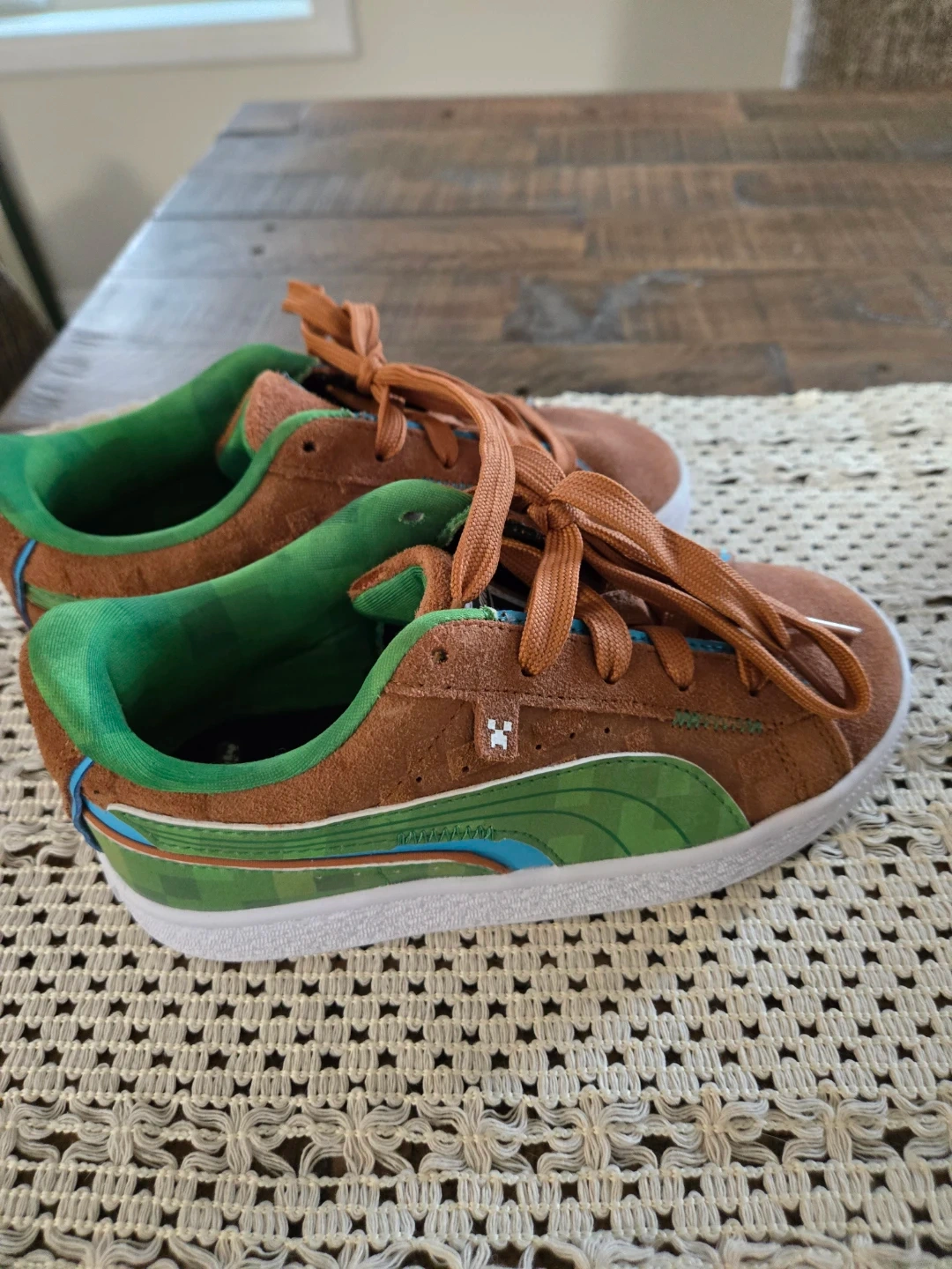 These Puma Suede Classic sneakers feature a fun Minecraft-inspired design. They have brown suede uppers with green accents and laces. Perfect for little gamers who love adventure!