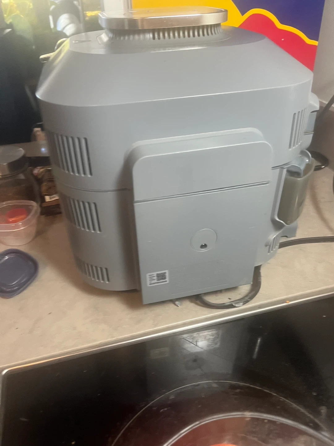 This is a Ninja Speedi air fryer. It's a multi-cooker with various functions like air frying and steaming. It's grey and has a digital control panel.