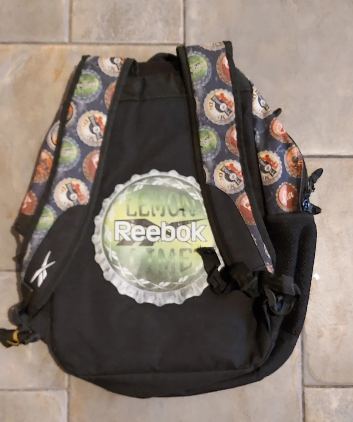 This Reebok backpack features a unique and colourful bottle cap design all over. It has a main zippered compartment and a front zippered pocket, plus side mesh pockets. It's great for carrying essentials for school or everyday use! In very good condition