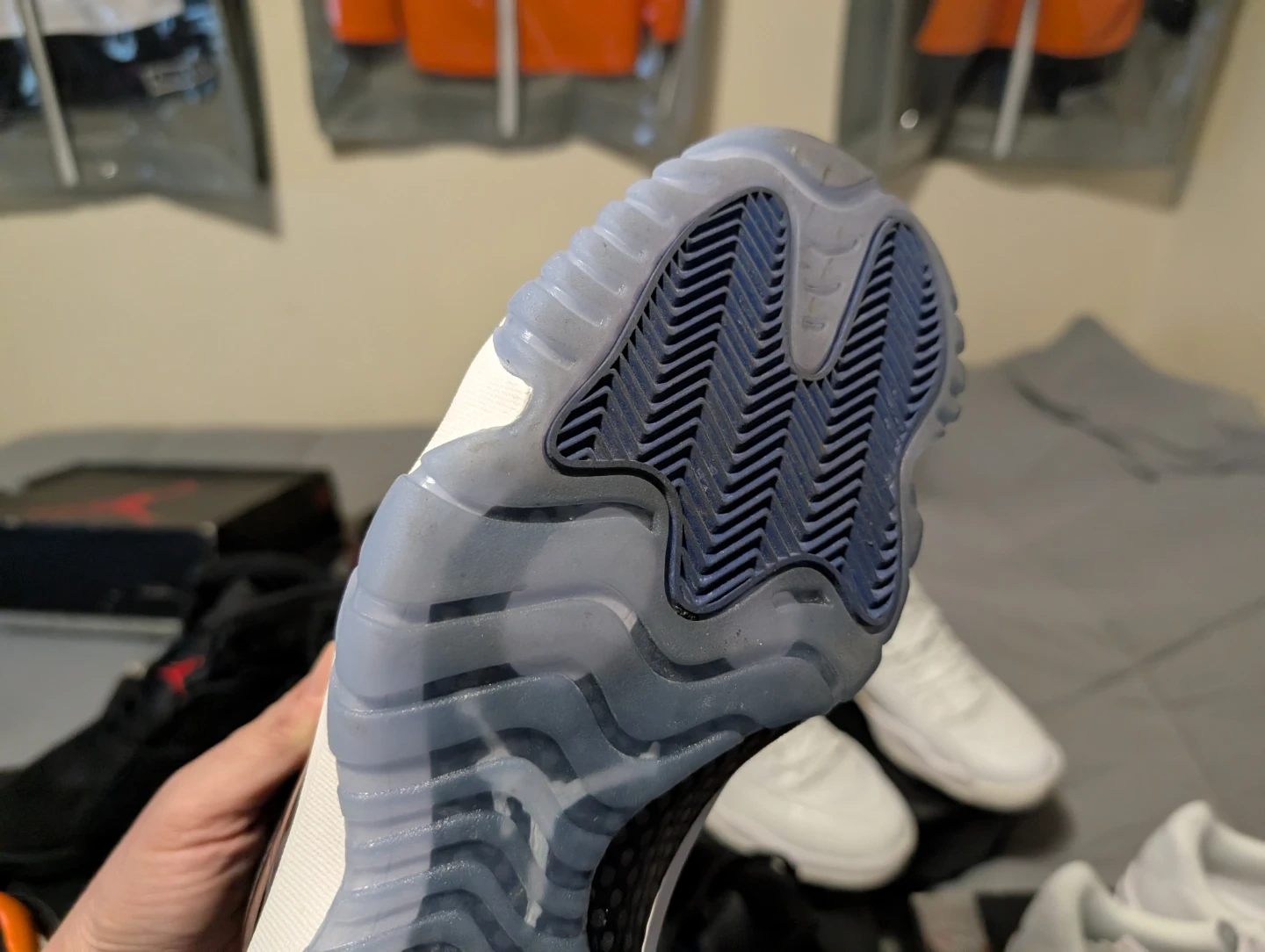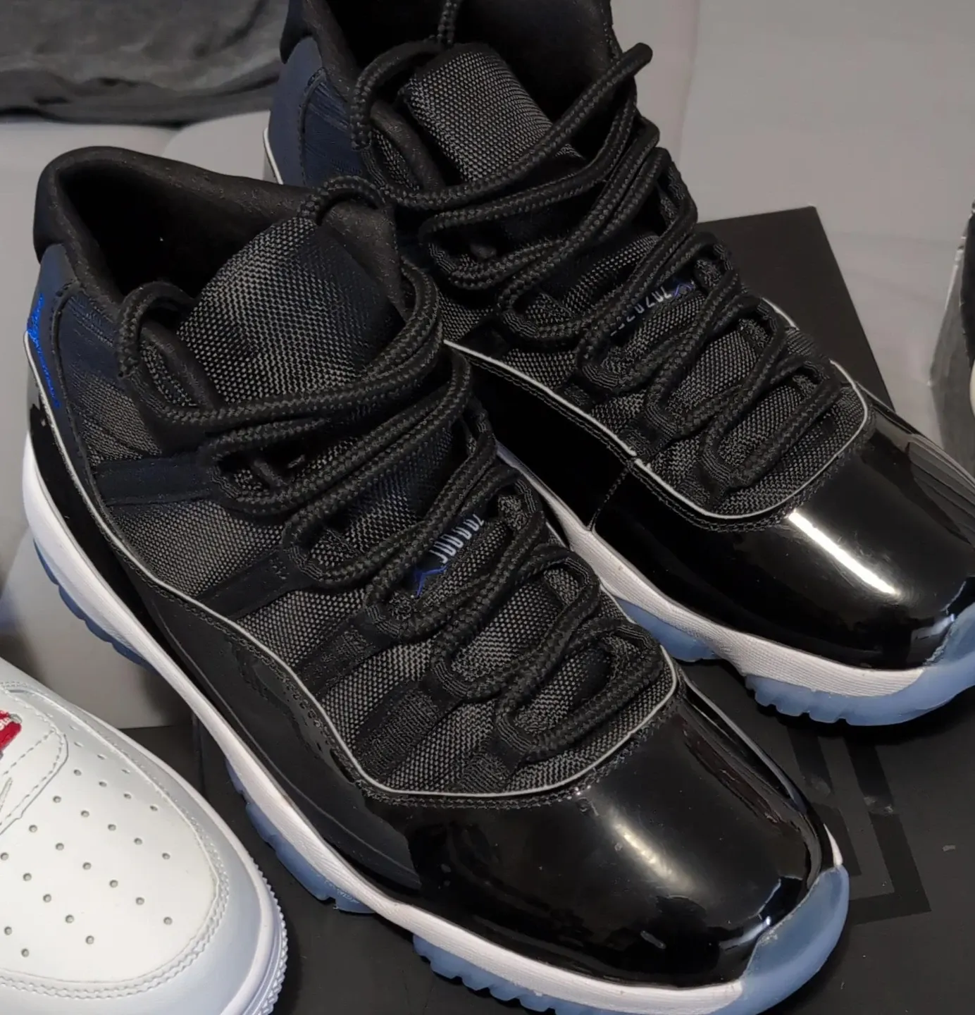 Classic Air Jordan 11 Retro sneakers in the iconic "Concord" colourway. Features a black ballistic mesh upper with patent leather accents and a translucent blue outsole. Includes the original box. Pick up only. Thank you