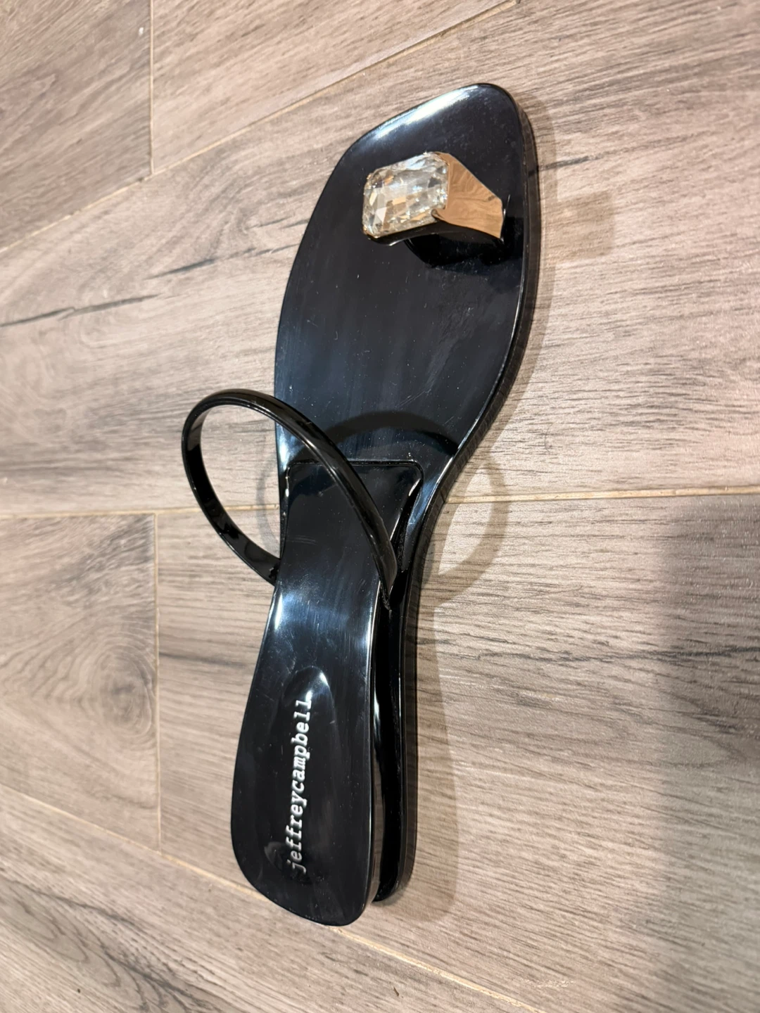 These Jeffrey Campbell Balia Jelly Thong Flats are in perfect condition, never worn! They're a stylish and comfortable choice for warm weather. The thong style and jelly material make them perfect for casual wear. They feature a unique design with a gem on the toe.