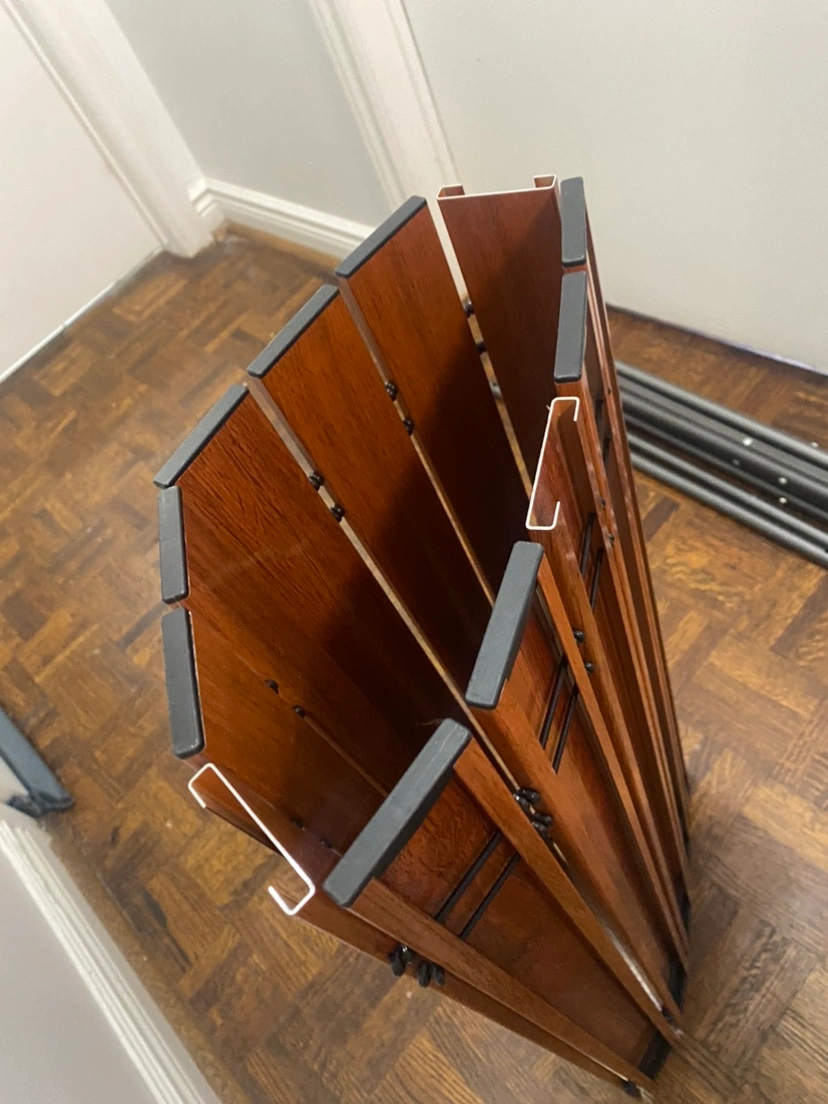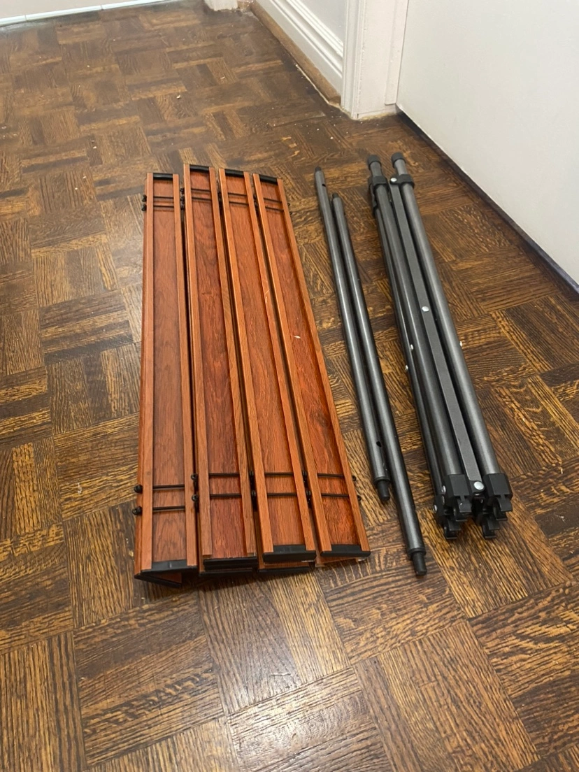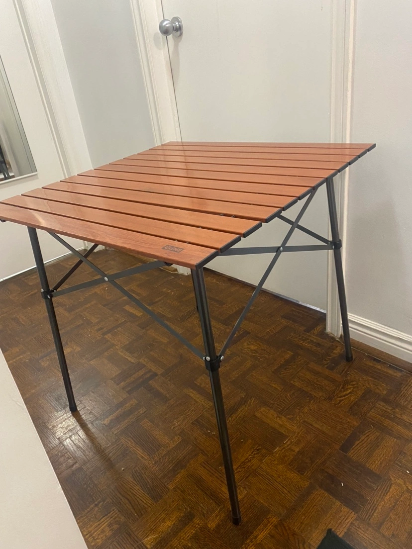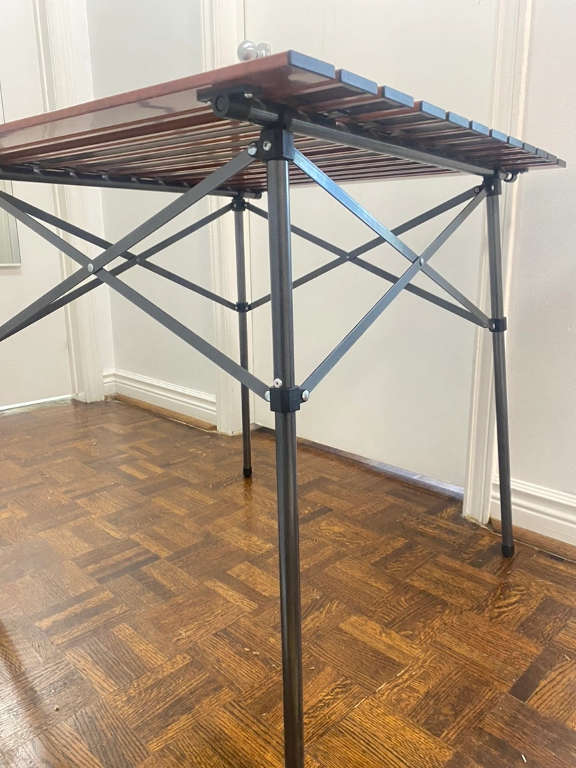 This table folds flat for easy storage. It is made of wood and metal and has a brown finish. It is in good condition.