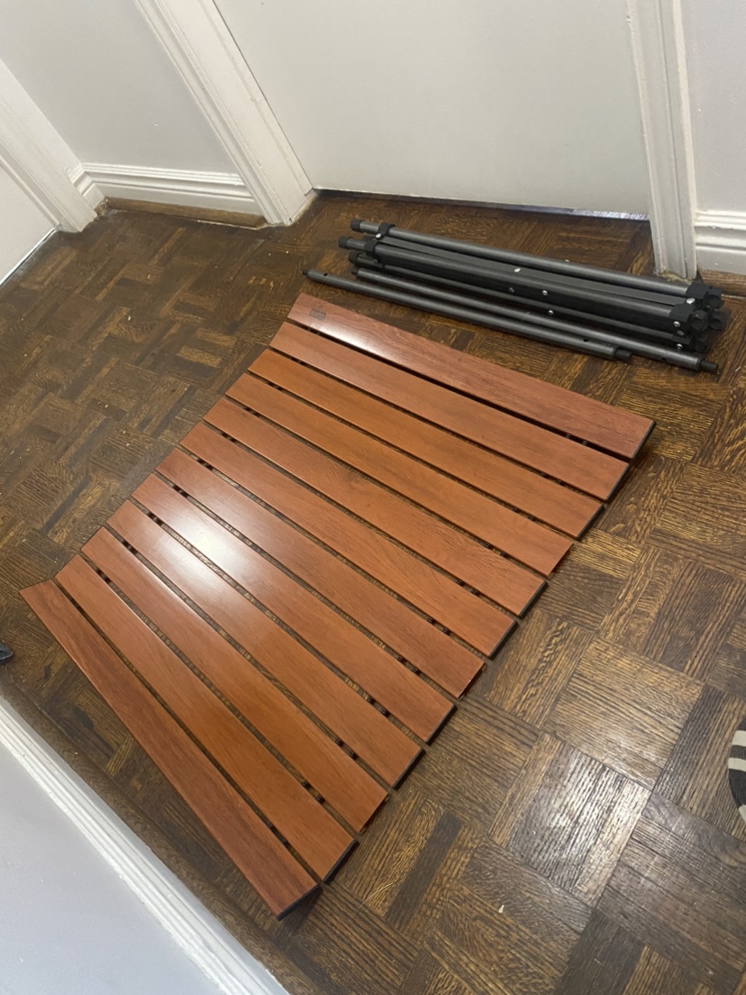 This table folds flat for easy storage. It is made of wood and metal and has a brown finish. It is in good condition.