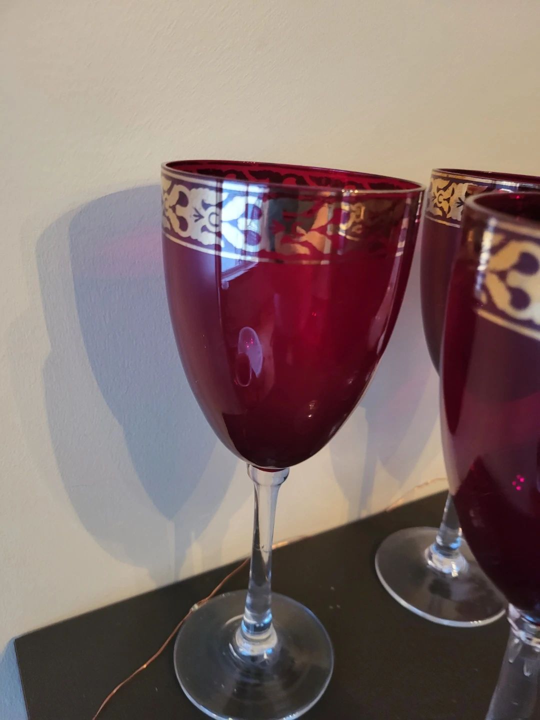 These elegant crystal wine glasses are a rich ruby red and feature a delicate gold trim around the rim. They're perfect for adding a touch of sophistication to any dinner party or special occasion.
