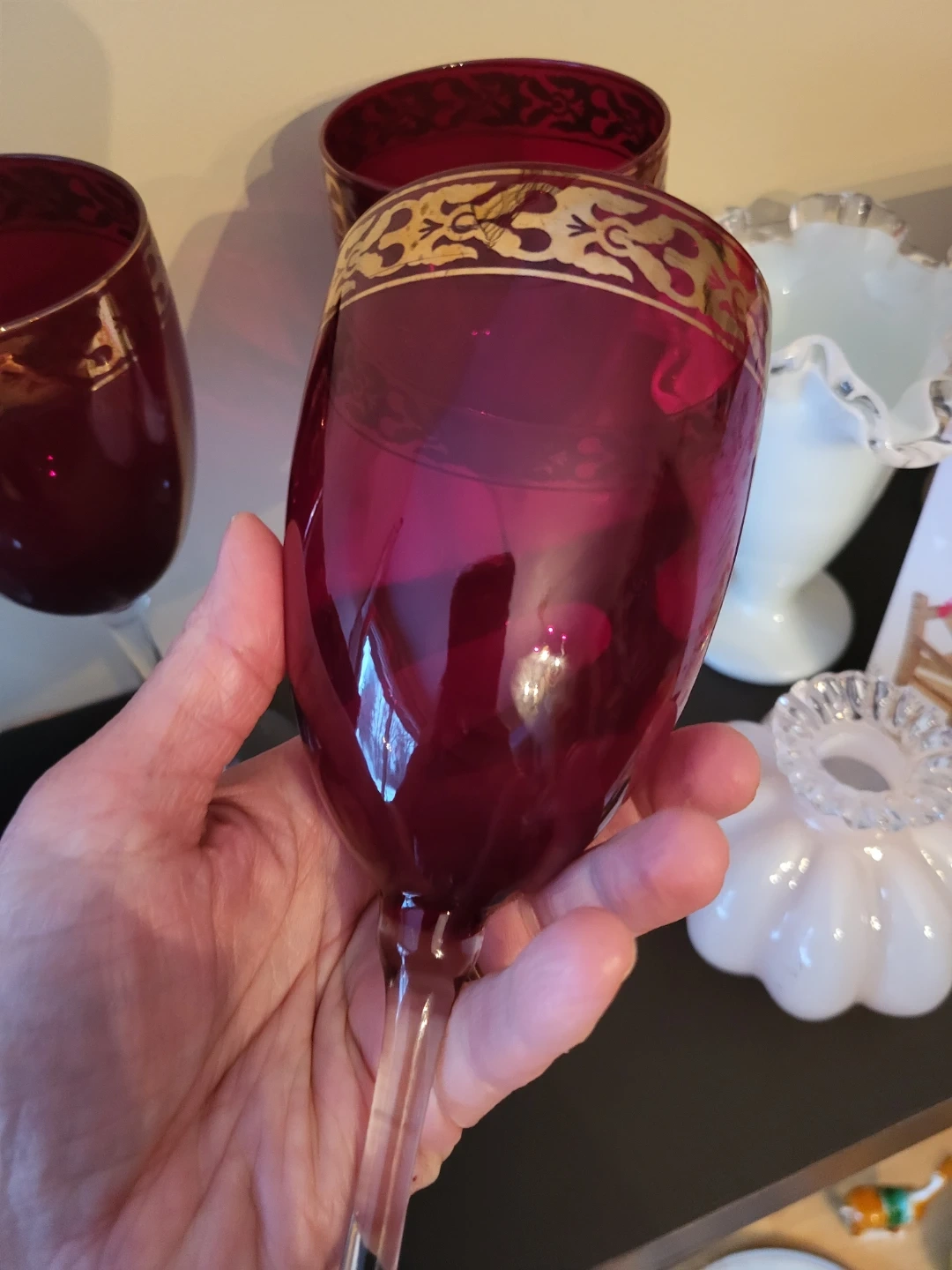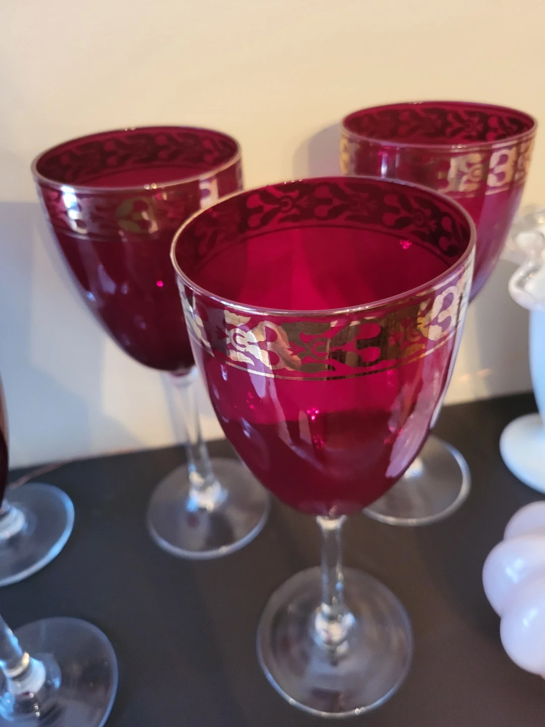 Set of 5 Ruby Red Crystal Wine Glasses with Gold Trim