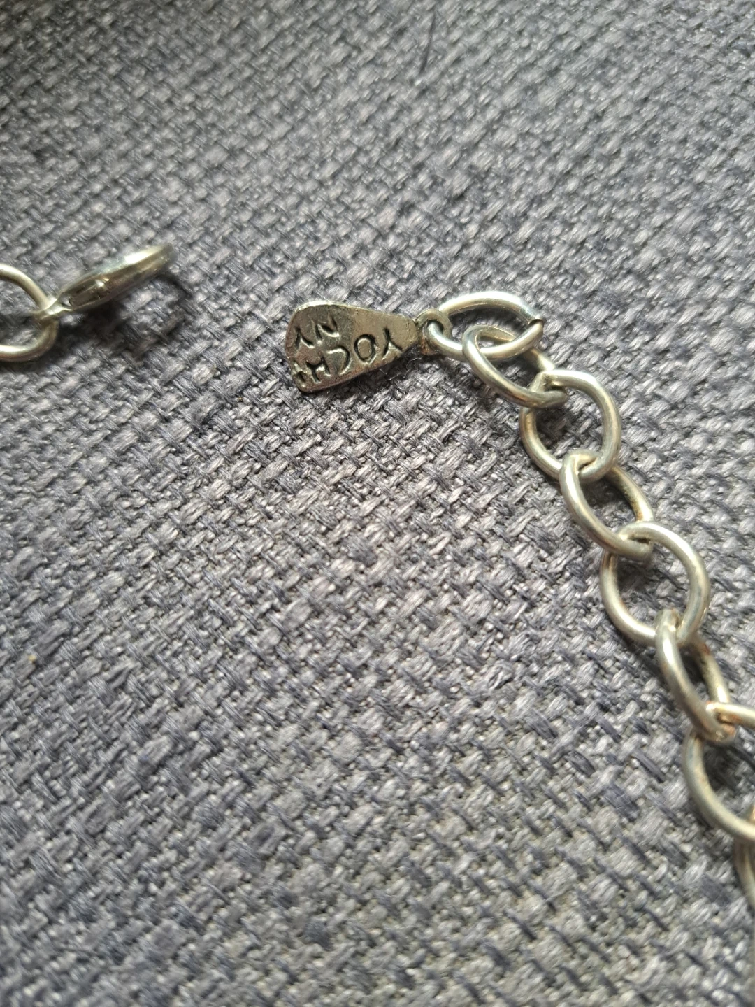 This Yochi NY features a silver-tone finish with a unique charm design. It includes a clasp closure for easy wear. The metal construction makes it a durable accessory.