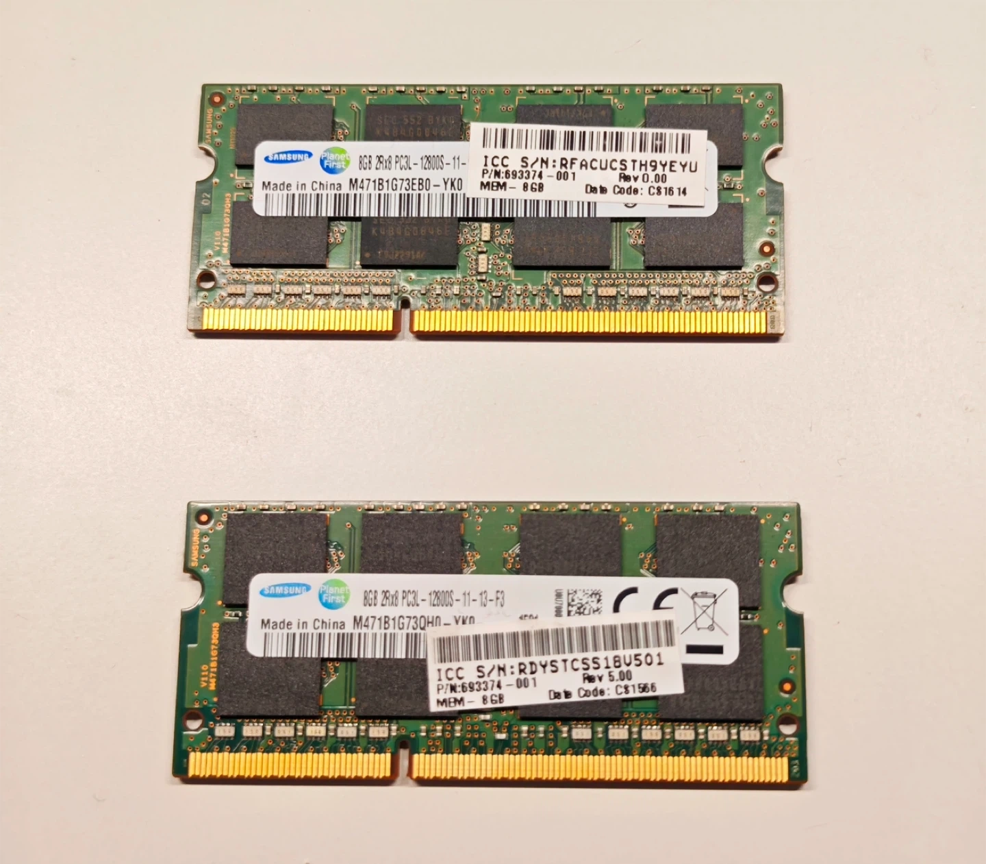 Two Samsung 8GB DDR3 PC3L-12800S laptop RAM modules. Each stick is 8GB capacity. They're for upgrading computer memory. This RAM is great for boosting your laptop's performance!