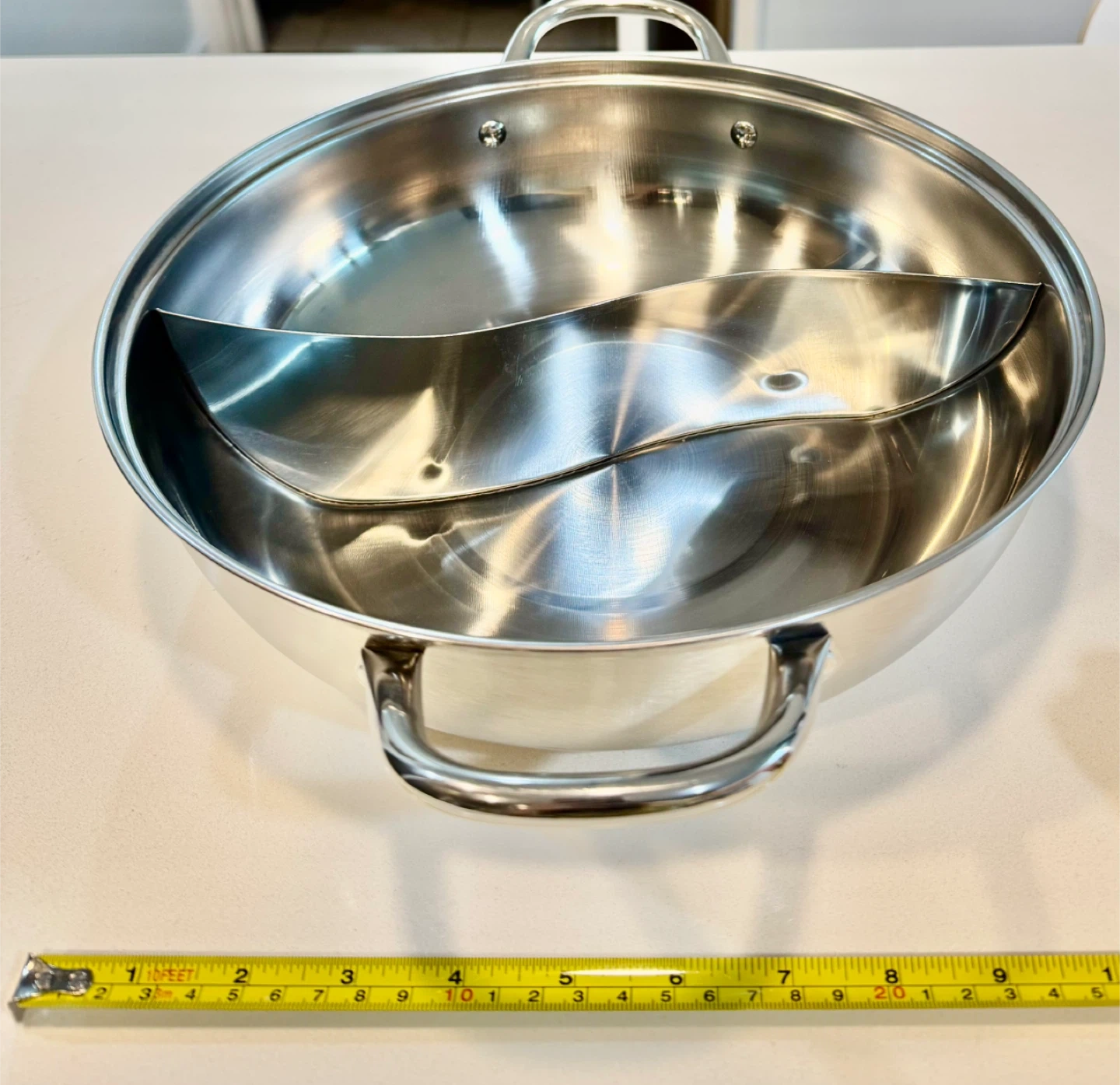 This is a dual-sided stainless steel hot pot, perfect for enjoying two different broths at once. It comes with two ladles, one slotted and one solid. The pot features anti-scald handles and is made from durable stainless steel.