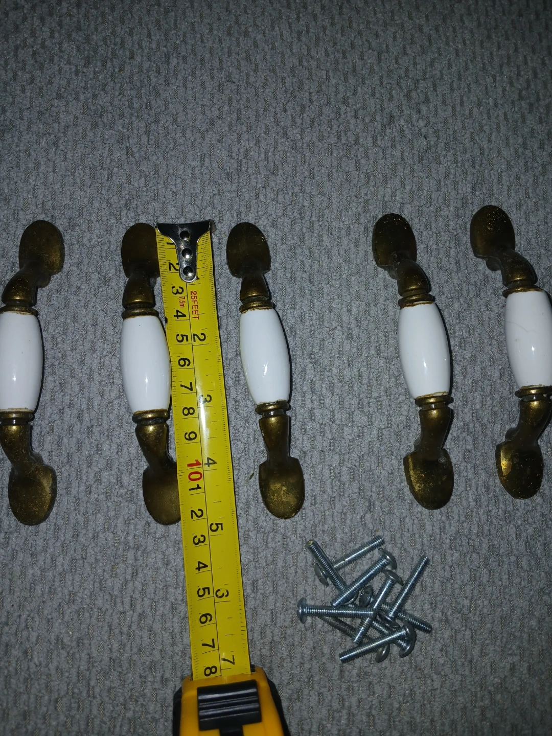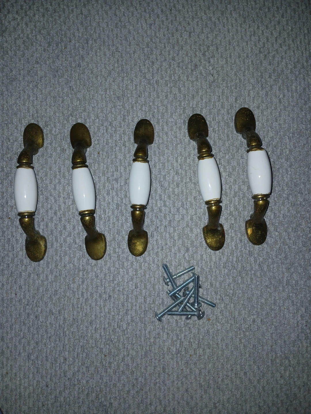 This is a set of five cabinet drawer pulls. They feature white ceramic inserts with brass-coloured metal bases and accents. Screws are included for installation. These pulls are about 3 inches centre-to-centre hole spacing.