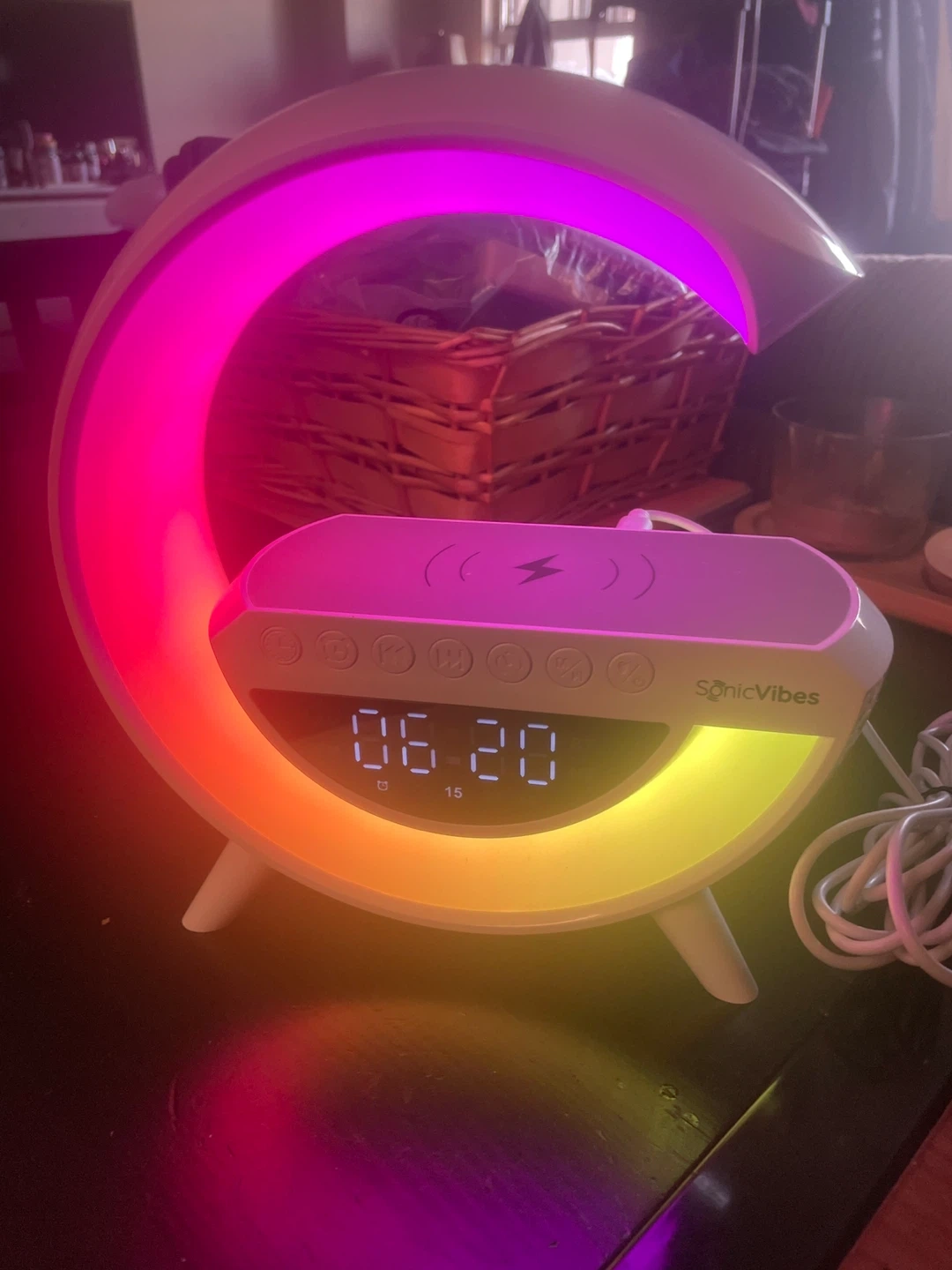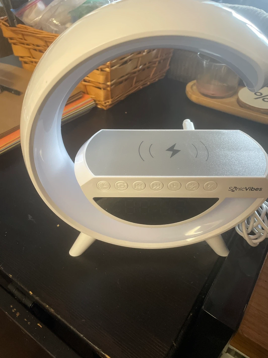 This SonicVibes lamp features a built-in wireless charger and an alarm clock. It's a bright white unit with a modern design. Includes buttons for alarm and light functions.