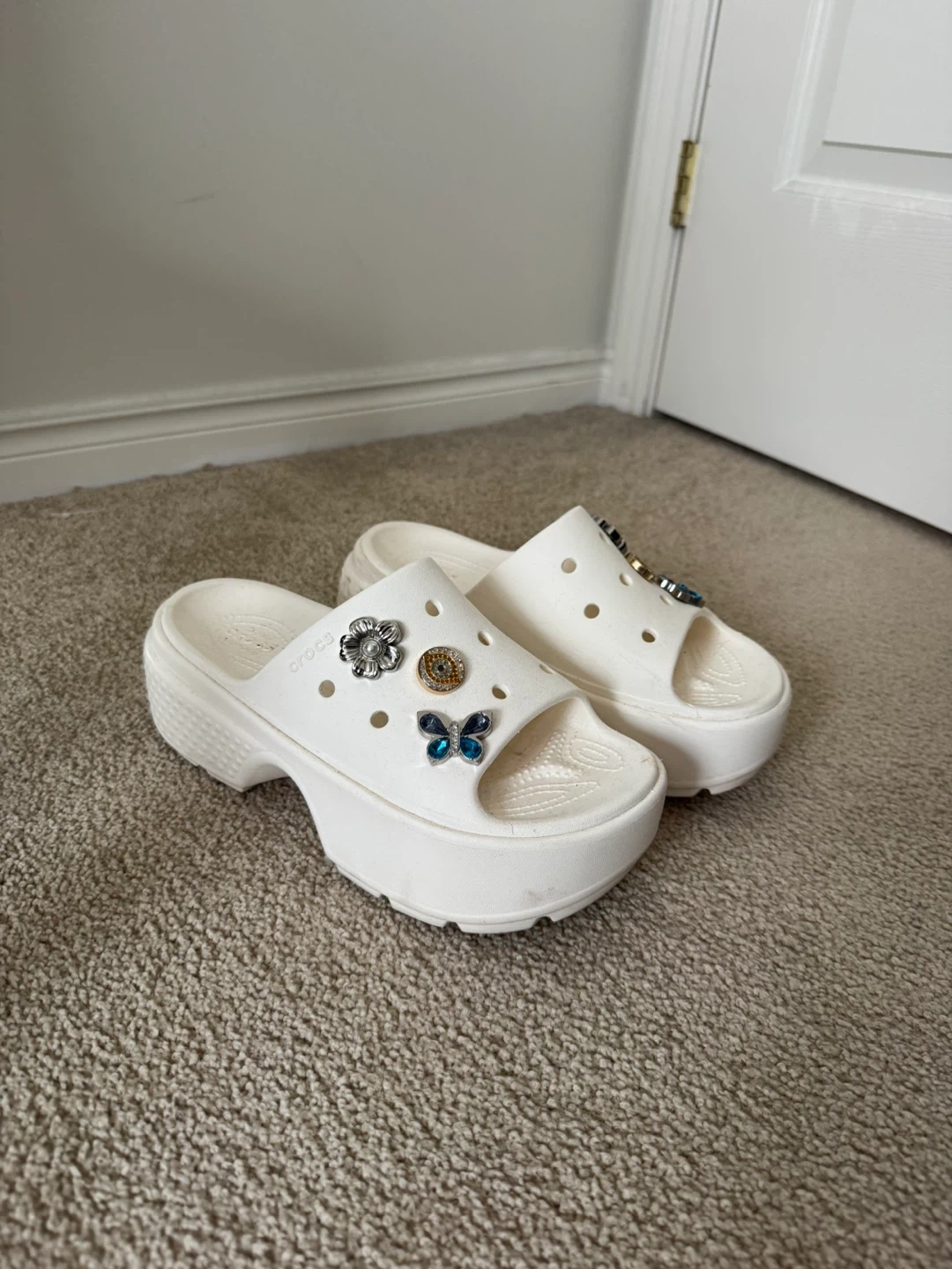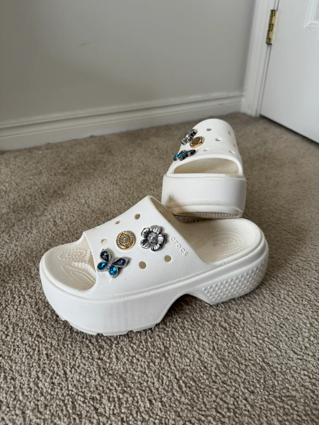 These white Crocs platform slides are a fun addition to any wardrobe. They feature decorative charms like flowers and butterflies for added flair. The platform sole provides a bit of extra height. These slides are great for casual wear, offering comfort and style!