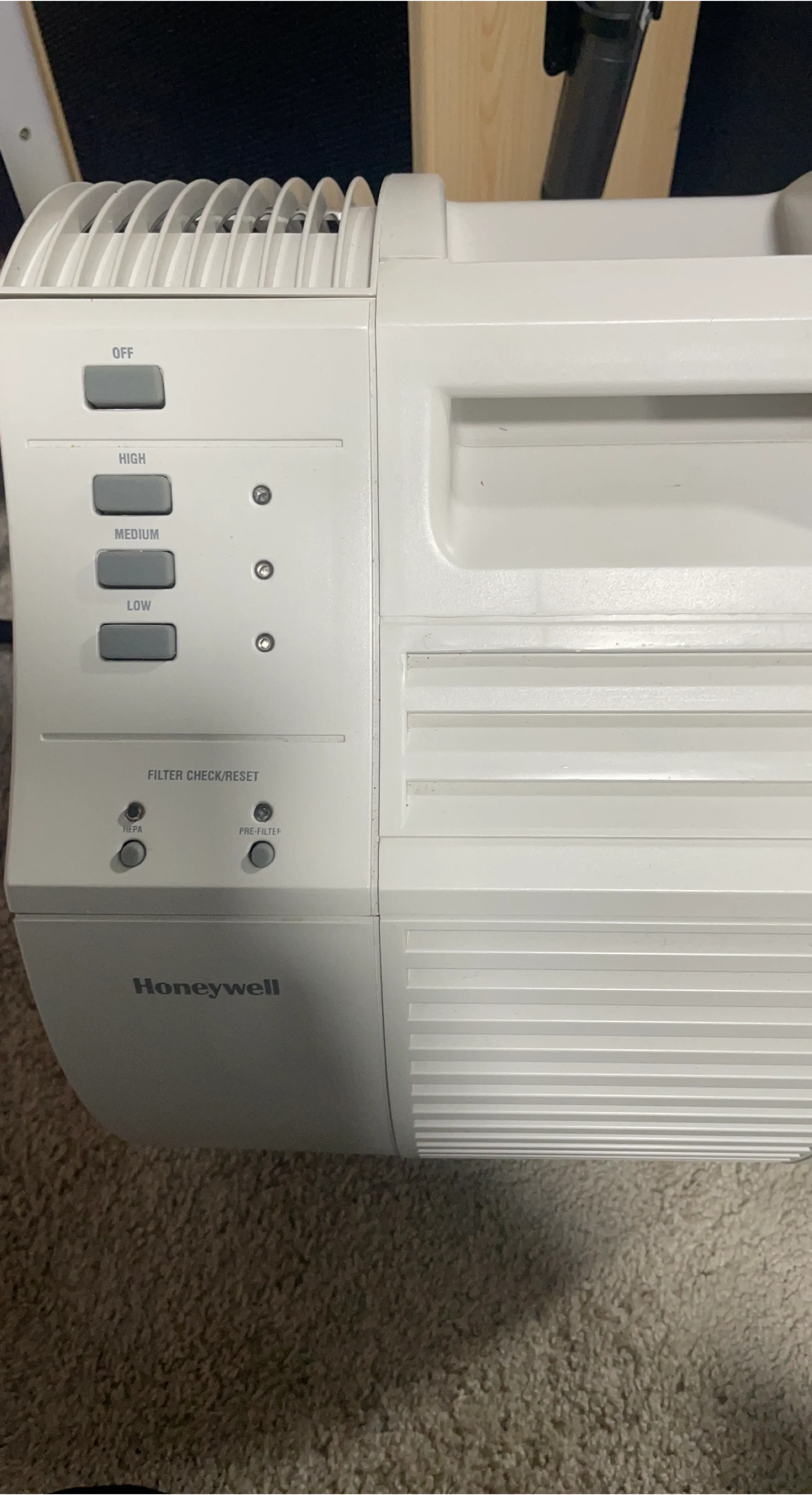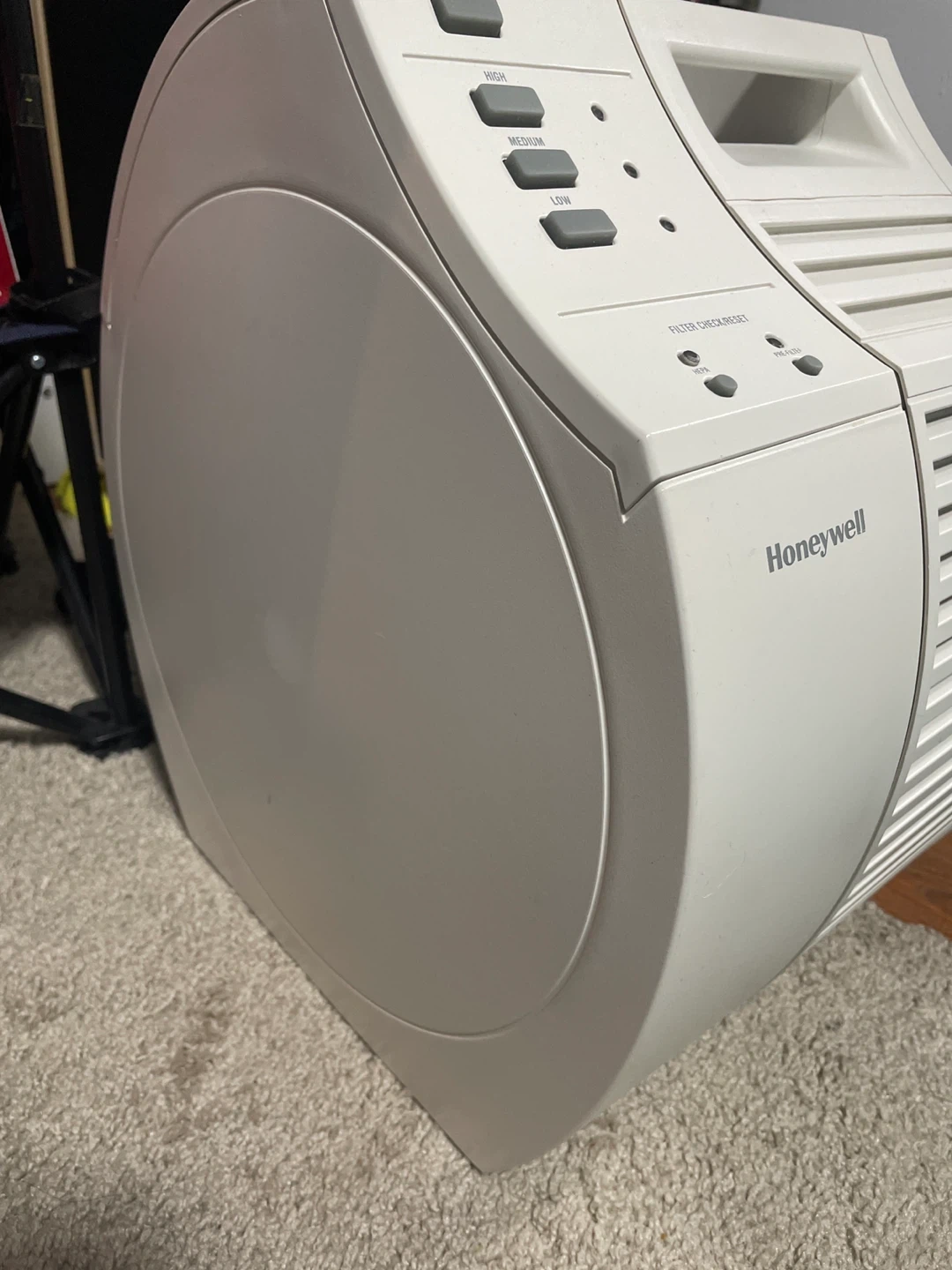 Selling a Honeywell air purifier. It has settings for high, medium, and low. There is also a filter check/reset button..