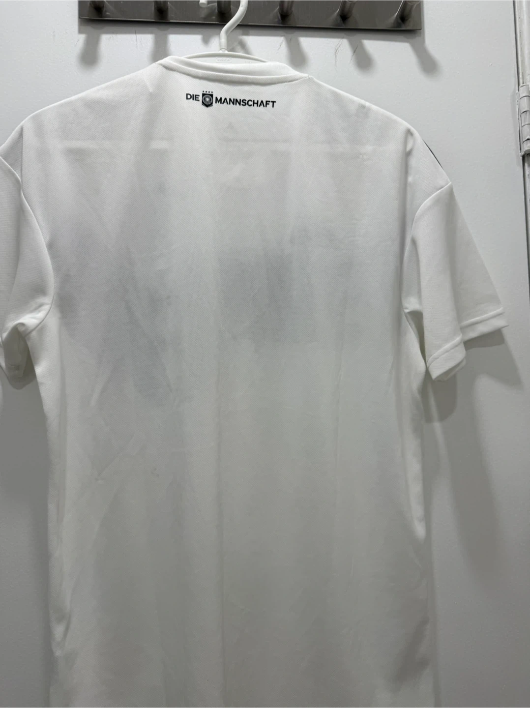 Offical White Adidas jersey with the German football crest and FIFA World Cup patch. Made with ClimaCool technology for breathability. Size medium.
