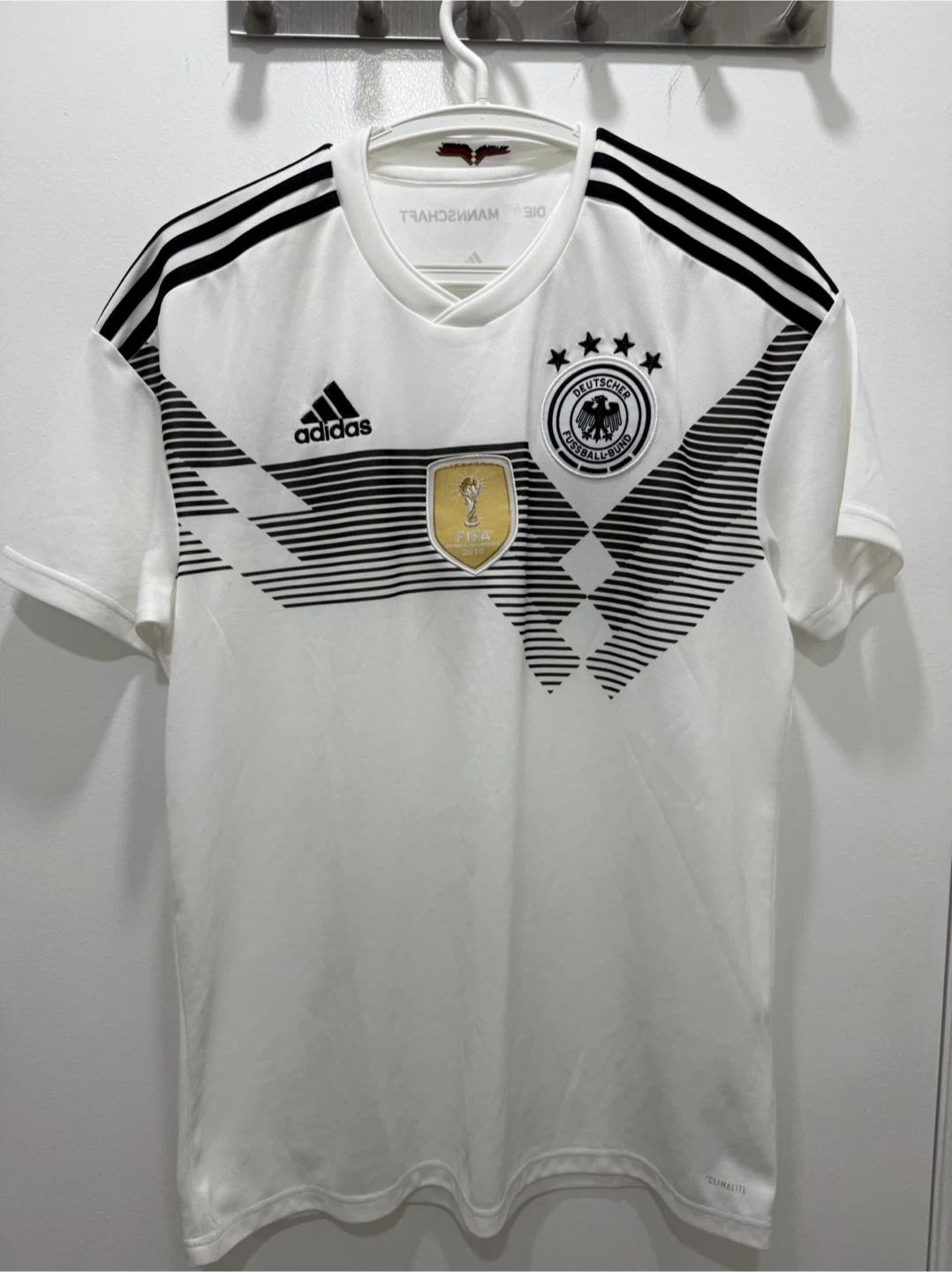 Offical White Adidas jersey with the German football crest and FIFA World Cup patch. Made with ClimaCool technology for breathability. Size medium.