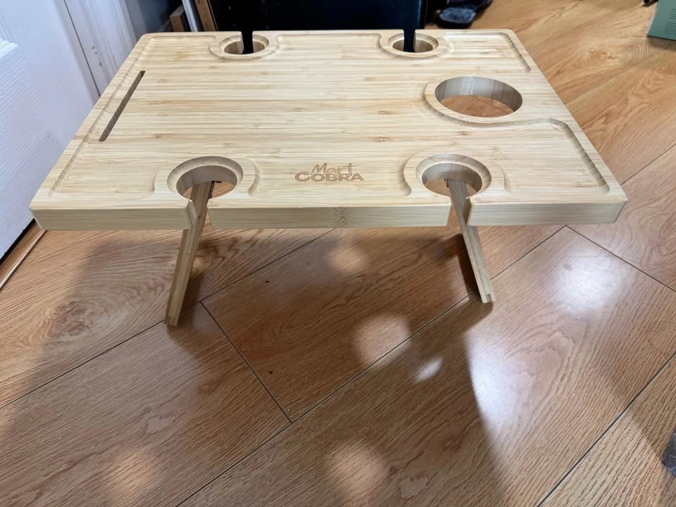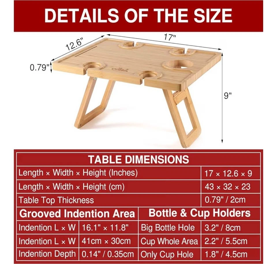 Great for picnics, outdoor events, or even as a kids' picnic table. This small folding table is wooden and foldable, perfect for the beach or as a tray table. It also features a bamboo wine glass holder for outside use.