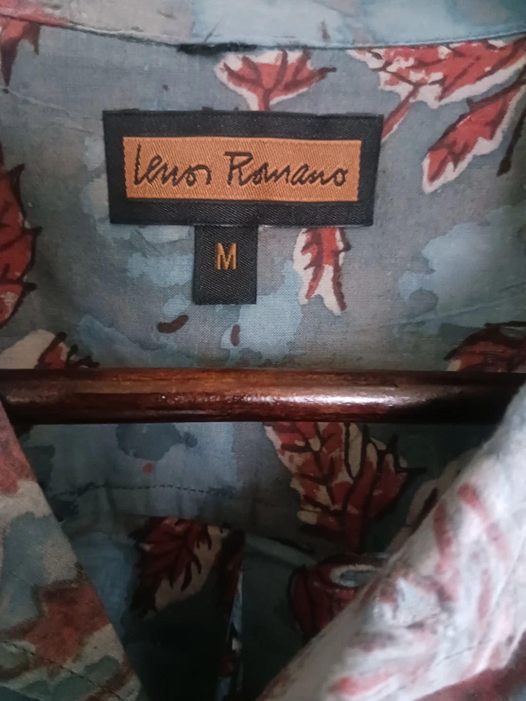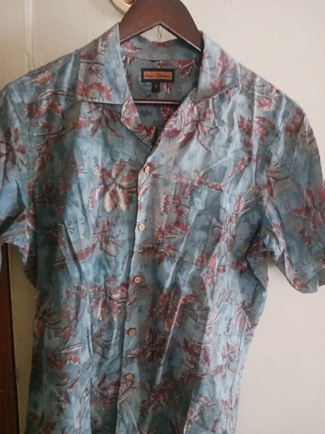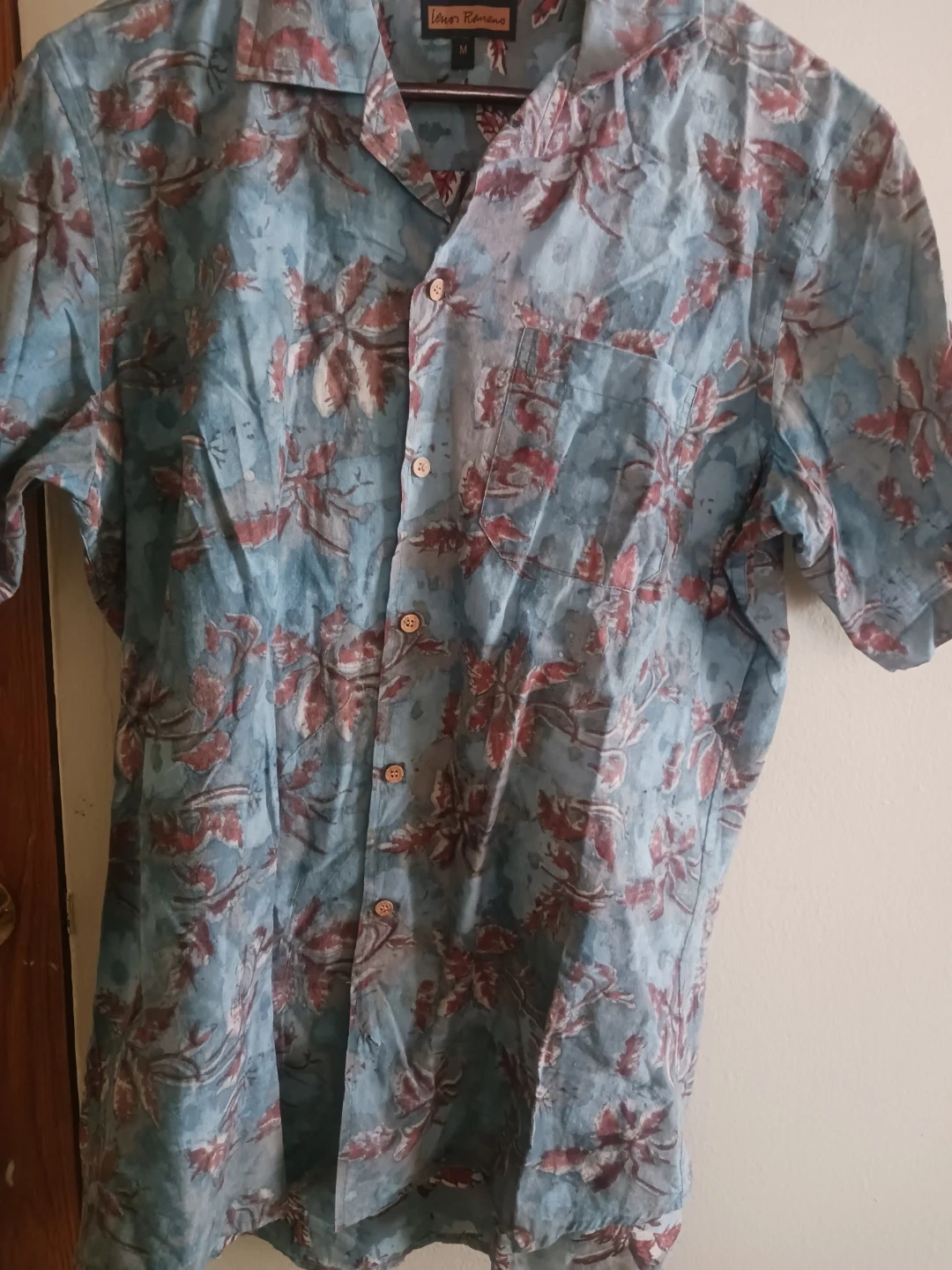 short sleeve button up shirt. Blue and red floral pattern. Size medium. Button front closure with a chest pocket.