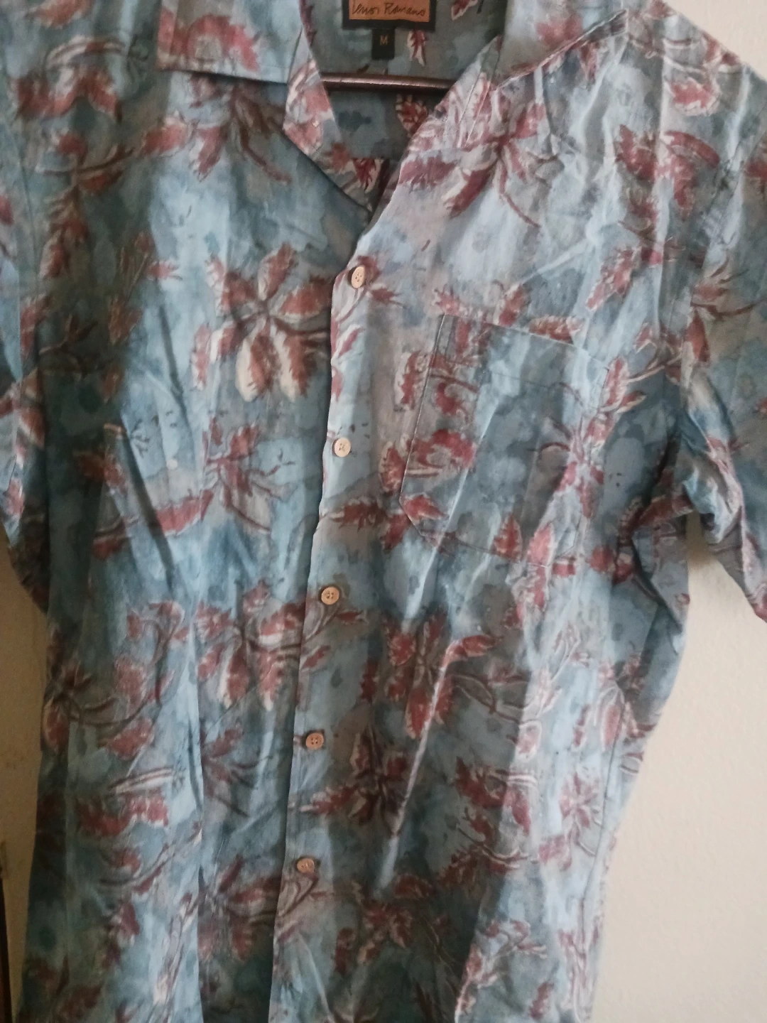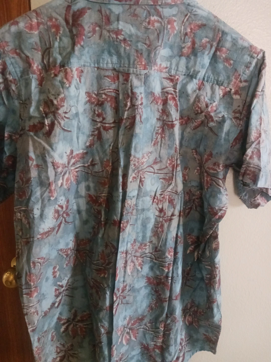 short sleeve button up shirt. Blue and red floral pattern. Size medium. Button front closure with a chest pocket.