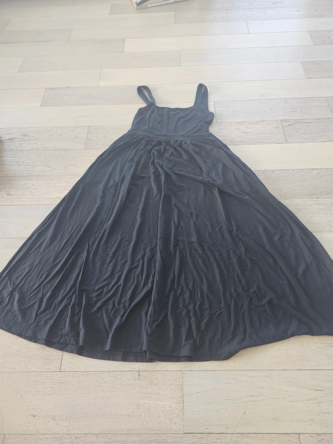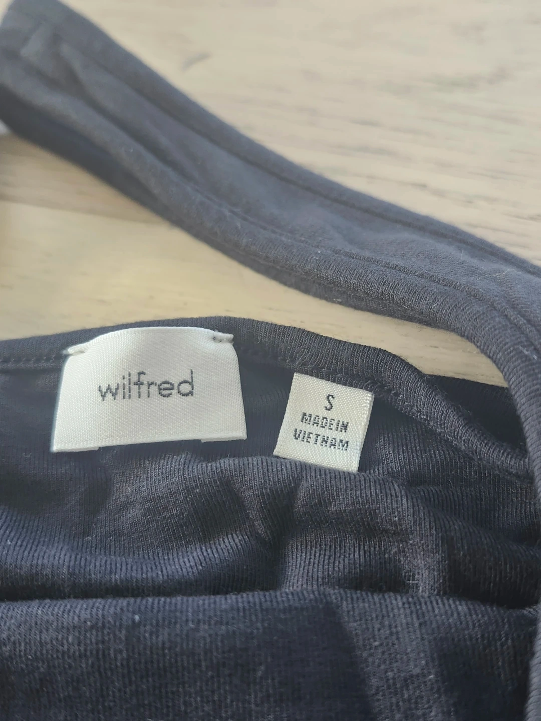 This is a Wilfred black maxi dress. It's a size small and made in Vietnam. It features spaghetti straps and a flowy skirt.