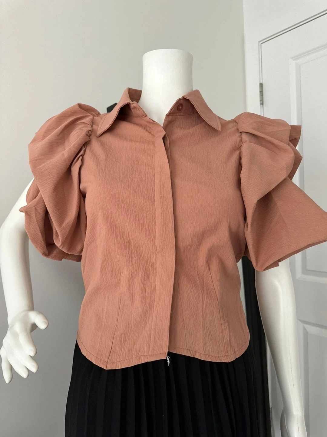 This women's shirt features stylish puff sleeves and a classic button-up front. It's made from a textured fabric in a lovely rose colour. This top is a great way to add some flair to your wardrobe!