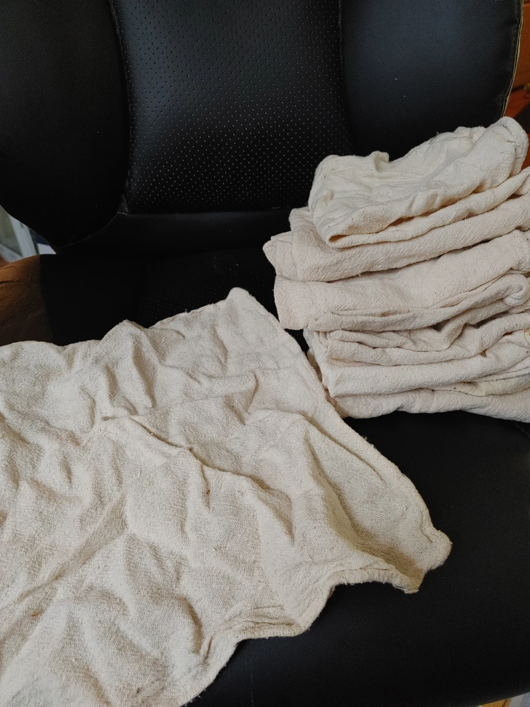 Bundle of 11 beige cotton rags or cloths. These are made of a textured woven material. They're versatile for painting, cleaning or other household tasks! 11 with no paint and another 7 with some paint but still usable.